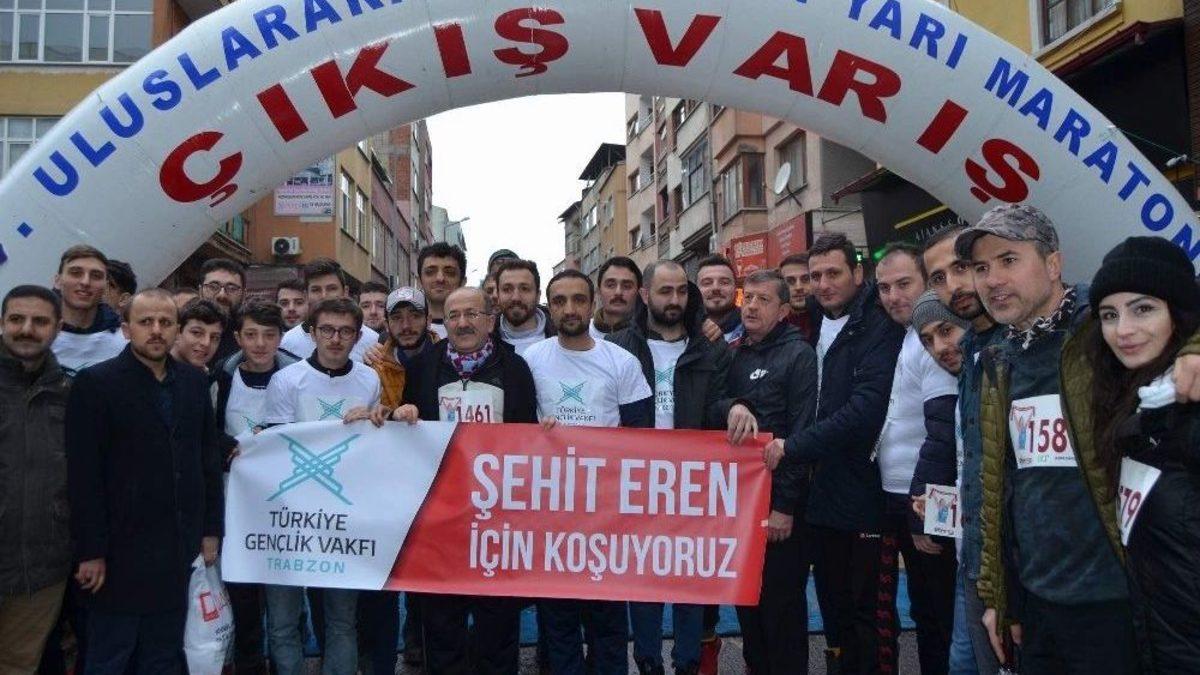 Şehit Eren Bülbül adına düzenlenen 38. Uluslararası Yarı Maratonu ve Halk Koşusu’na yoğun katılım olurken, Eren Bülbül’ün annesi Ayşe Bülbül oğluna ithaf edilen maratona katılarak duygulu anlar yaşadı.Trabzon’un düşman işgalinden kurtuluşunun 100. yıl dönümü etkinlikleri kapsamında şehit Eren Bülbül anısına "Eren için koşuyoruz" sloganıyla düzenlenen 38. Uluslararası Trabzon Yarı maratonu ve Halk Koşusu’na Trabzon Valisi Yücel Yavuz, AK Parti Trabzon Milletvekili Ayşe Sula Köseoğlu, Trabzon Büyükşehir Belediye Başkanı Orhan Fevzi Gümrükçüoğlu’nun yanı sıra sanatçılar da katılarak destek verdi.Koşunun startını şehit Eren Bülbül’ün annesi Ayşe Bülbül, Vali Yücel ile birlikte verirken organizasyonda renkli görüntüler yer aldı. Trabzon Valisi Yücel Yavuz, şehit Eren Bülbül adına düzenlenen maratona yoğun katılım olduğunu belirterek, "En anlamlı tarafı Eren Bülbül yavrumuzun şehidimizin ismiyle bu maraton tertip edildi. Yoğun bir katılım çok güzel bir ilgi var. Uluslararası standartta bir organizasyon artık geleneksel hale geldi Trabzon’daki yarı maratonumuz diğer müsabakalarımız. Katkısı olan herkese çok teşekkür ediyorum" dedi.Eren Bülbül’ün annesi Ayşe Bülbül, çok duygulandığı belirterek, "Heyecandan bir şey konuşamıyorum. Ne güzel bir duygu. İyi ki doğru Eren" dedi.Trabzon Büyükşehir Belediye Başkanı Orhan Fevzi Gümrüçüoğlu da tarif edilemez duygu içerisinde olduğunu belirterek, "Trabzon’un yüzüncü kurtuluş yıl dönümü. 1917 - 2017 ve bugün 2018. 2018’de uluslararası yarı maratonu güzel sevgiyle bir güzel dua ile bir güzel şehadet ile birlikte sembolleştirdik. O da Eren Bülbül evladımızın her zaman kalbimizde yaşayacaksın, iyi ki varsın Eren diye başlattığımız dünyaya barışı kardeşliği sporun ön gördüğü insanların kucaklaşmasını da mesaj olarak verebilecek bir birlikteliği bir cümleyi bir araya getirdik. Başta Eren Bülbül’ümüz onunla şehit olan Ferhat Gedik astsubayımız ve bütün şehitlerimizin mekanının cennet olmasını temenni ederken onun anneciği ile birlikte bugünkü yarı maratonumuzu başlattık. Tarif edilemez duygular içerisindeyiz. Bütün sporcular gönlümüzde şampiyondur. Aslında en önemli olanın sporunda Türkiye’deki en önemli merkezlerinden birisi olan Trabzon’umuzdan insanlığın tümüne terörün durmasını bunun için herkesin barış ve kardeşliği gaye edinmesini en büyük mesajımız olarak vermek istiyoruz" diye konuştu.AK Parti Trabzon milletvekili Ayşe sula Köesoğlu ise Trabzon’un düşman işgalinden kurtuluşunun 100 yıl olması anlamında önemli bir yıl dönümünü idrak ediyoruz. Bu önemli yıl dönümünde hepimizin gönlünde ayrı yeri olan şehitlerimizin simge ismi Eren adına bir koşu düzenliyoruz. Bu anlamda hem Kurtuluş Savaşımızda hem de Afrin’de mücadele eden askerlerimize destek olmak buradan hem dua göndermek hem de onların yanında olduğumuzu bildirmek anlamında önemli bir organizasyon. Eren şehitlerimizin sembol ismi olduğu için Trabzon’lu da olduğu için ayrıca bir gurur kaynağımız oldu” dedi.Trabzonlu sanatçı Yusuf Güney ise Eren için bir arada bulunduklarını ifade ederek, "Sözlerime iyi ki varsın Eren olarak başlamak istiyorum. Allah şehidimizin mekanını cennet eylesin, Allah ailesine sabırlar versin. Ne söylersek söyleyelim, ateş düştüğü yeri yakıyor. Çok üzüldük hala üzülüyoruz. Allah bütün şehitlerimizin mekanını cennet eylesin. Bu tabloda benim de olmam tabi ki için gurur verici. Bugünün anlam ve önemi çok ayrı. Asıl biz Eren için buradayız” diye konuştu.