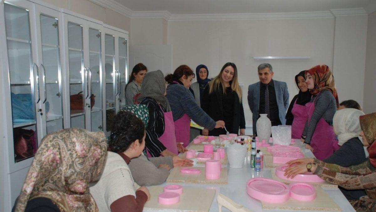Vali Aykut Pekmez’in eşi Yeşim Pekmez, Halk Eğitim Merkezi Müdürü Ramazan Güllü ile birlikte kadın giyim, ev tekstili ürünleri hazırlama, seramik ve cam teknolojisi, oyun odası ve Suriyelilere yönelik açılan Türkçe öğrenim kurslarını gezdi.