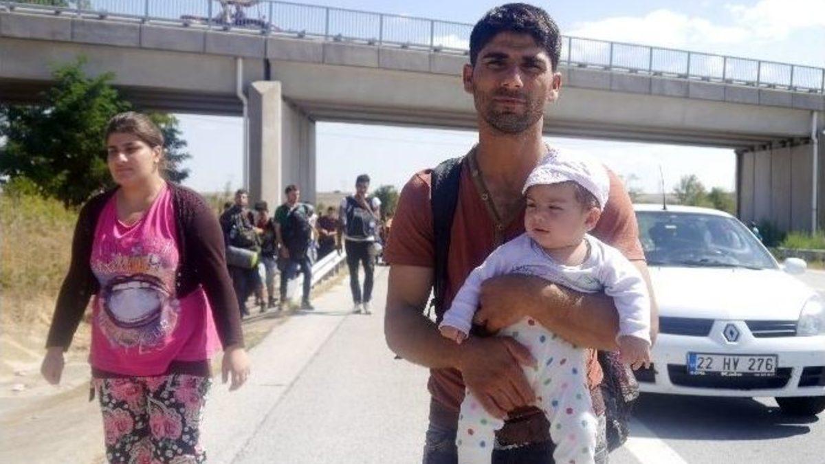 Ülkelerindeki iç savaştan kaçan Suriyeliler, Edirne’ye yürüyor. Yüzlerce Suriyeli sığınmacı, gruplar halinde 30 kilometre boyunca yürüyerek Edirne gişelerine geldi.Ülkelerindeki iç savaştan kaçan Suriyeliler, ellerinde bavulları ile birlikte Edirne’nin Havsa ilçesi gişelerinden il merkezine doğru otobandan yürüyor. Avrupa’ya gitmek üzere Edirne’ye gelmeye çalışan Suriyeli sığınmacıların önünü jandarma ve polis ekipleri, otoban kenarında kesti. Yüzlerce Suriyeli sığınmacı, ellerinde bavulları ve küçük çocuklarıyla beraber Almanya’ya gitmek istediklerini belirterek yürüdüklerini söyledi.Suriyeli sığınmacılara müdahale eden jandarma ekipleri, Suriyelilerin Edirne’ye girişine izin vermedi. Yüzlerce Suriyeli, Edirne’ye girebilmek için yol kenarında bekliyor.