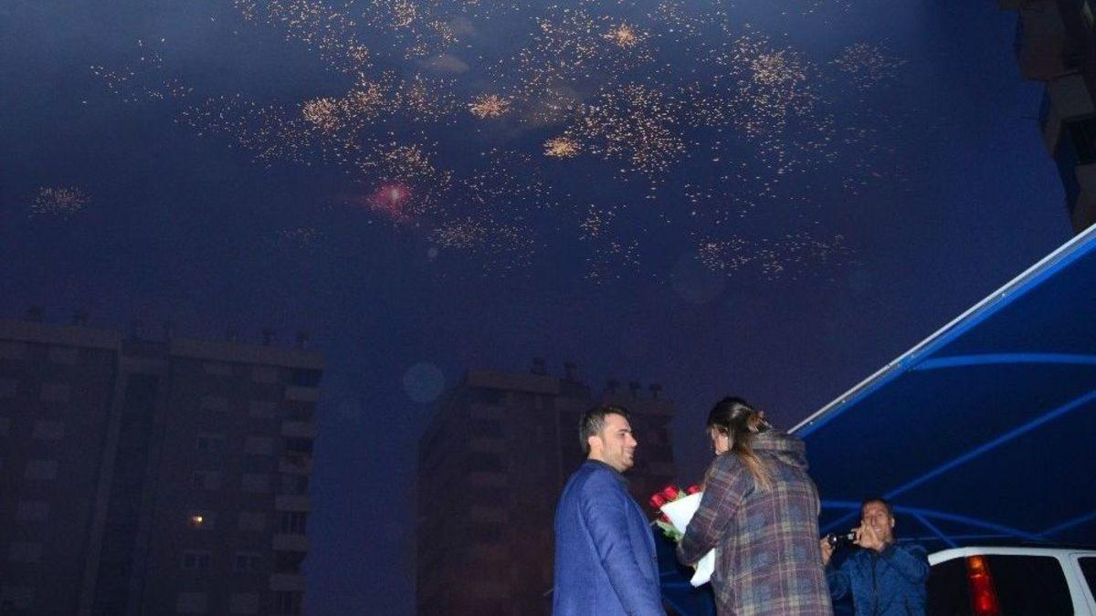 Antalya’nın Kumluca ilçesinde kız arkadaşına havai fişek patlatarak sürpriz evlilik teklifinde bulunmak isteyen turizmci gence izinsiz patlayıcı madde kullanmaktan ve toplum huzurunu bozmaktan dolayı 250 TL para cezası kesildi.Kumluca’da kız arkadaşına jest yapan turizmci gencin macerası polis karakolunda sonlandı. Finikeli turizmci 25 yaşındaki Sinan Şahin, Kumluca Karşıyaka Mahallesinde oturan kız arkadaşı 20 yaşındaki Gamze Makas’a sürpriz evlilik teklifinde bulunmak istedi. Sinan Şahin, kiraladığı bir organizasyon şirketine, kız arkadaşının oturduğu apartmanın önünde mumlardan kalp resmi, gül yapraklarıyla "Seni Seviyorum" yazdırdı ve apartman çıkışına meşaleler yaktırdı. Şahin, daha sonra da başka bir arkadaşına kız arkadaşını apartman çıkışına çağırttı.Hava fişeklerin sesi polis karakoluna ulaştıApartmanın 5’inci katından aşağıya inen Gamze Makas, gördükleri karşısında şok oldu. Sinan Şahin daha sonra ellerindeki güllerle apartman girişine geldi ve kız arkadaşına sarıldı. Bu arada patlayan hava fişeklerin sesi 100 metre ilerdeki polis karakoluna ulaştı. Evlilik teklifinde bulunmaya hazırlana genç paniğe kapılarak kiraladığı organizasyon firması çalışanı ile apartman önünden uzaklaştı.Güvenlik kameralarından tespit edildiHavai fişek seslerini duyan polisler olay yerine gelmekte gecikmedi. Polis ekipleri apartman girişindeki güvenlik kamerası görüntülerinden havai fişeklerin kimin patlattığını tespit etti. Kız arkadaşına yaptığı jestten sonra Finike ilçesine dönen Sinan Şahin, Kumluca İlçe Emniyetinin çağrısı üzerine Kumluca İlçe Emniyet Müdürlüğüne gelerek ifade verdi. Kumluca Emniyeti tarafından Sinan Şahin’e izinsiz patlayıcı madde kullanmaktan ve toplum huzurunu bozmaktan dolayı 250 TL para cezası kesildi.