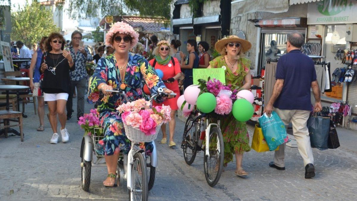 Kadınlar, konuşmanın ardından birbirinden renkli ve süslü bisikletlerine binip Alaçatı’nın sokaklarında pedal çevirdi.