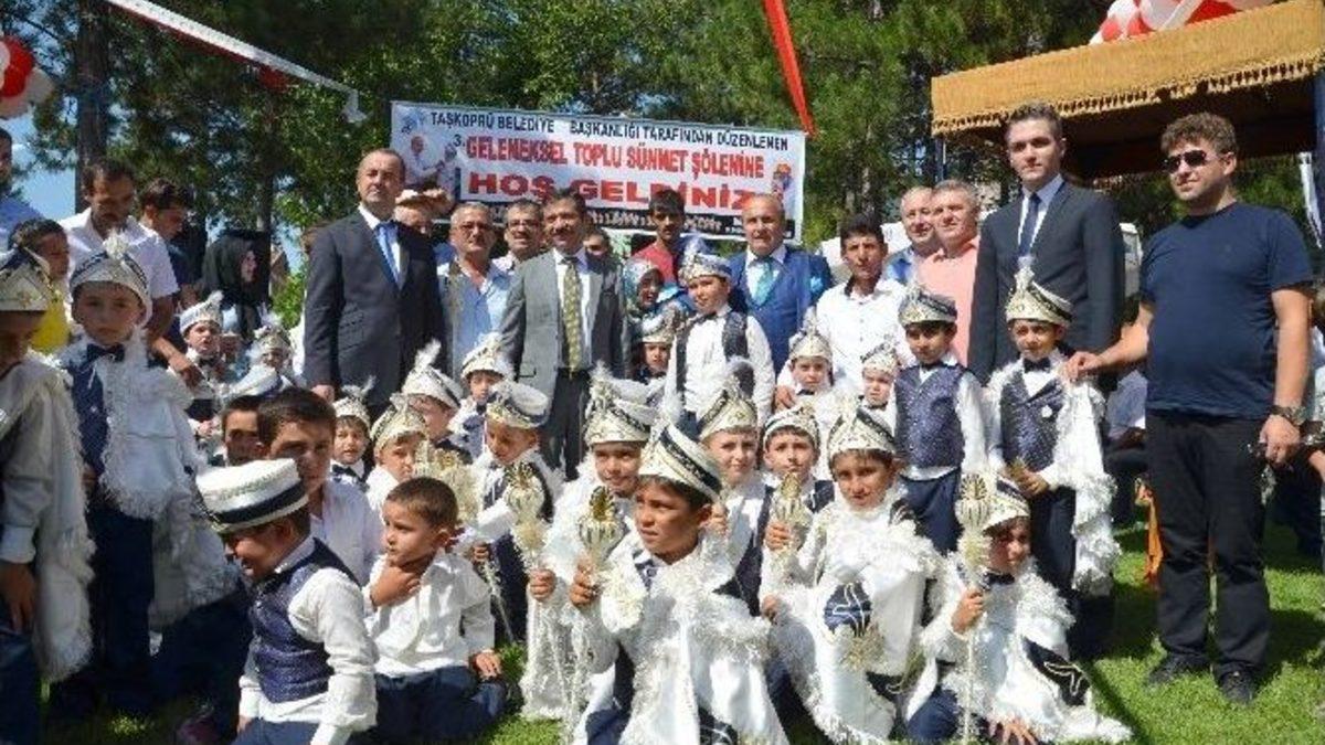 Taşköprü Belediyesi tarafından Toplu Sünnet Şöleni düzenlendi. Şölende 120 çocuk sünnet olarak erkekliğe ilk adımı atmış oldu.Şeyh Hüsamettin Tekke Cami bahçesinde gerçekleştirilen Toplu Sünnet Şöleninde konuşan Vali Mesut Yıldırım, 15 Temmuz gecesi Türk Milletinin; tarihinin en büyük ihanetiyle karşı karşıya kaldığını belirterek, “Ancak liderinin çağrısıyla kimseye pabuç bırakmamış ve dik durmuştur. Bu dik duruşunu tüm Dünyaya da göstermiştir. Türk milletinin milli iradesi tehdit ve risk altında iken mücadelesi tüm milletlere örnek teşkil etmiştir. Her şerden bir hayır çıkar anlayışıyla bütün ayrılıklarımıza rağmen nasıl bir millet olduğumuzu bütün dünyaya gösterdik. Bu sünnet şöleninde her siyasi kesimden herkes bulunuyor. Bu birlikteliğimizi halen devam ettiriyoruz. Hepimiz aynı amaçla birbirimize sevgiyle, saygıyla yaklaşmamız gerekiyor. Bütün farklılıklarımızla zenginleştiğimizin farkına vardık. Birbirimizi daha iyi anlayan bir millet haline geldik” dedi.Daha güzel yarınlara ancak daha güzel iyiliklerle ulaşabileceklerinin farkında olduklarını söyleyen Vali Yıldırım, “Her gün yeni şehitler verdiğimiz bir ortamda geleneksel festival havamızın sürmesini elbette bekleyemezdik. Bu nedenle dinimizin emirlerinden birini yerine getirmek için festival yerine sadece sünnet şölenimizi gerçekleştiriyoruz” diye konuştu.15 Temmuz gecesi anlatan AK Parti Kastamonu Milletvekili Metin Çelik ise “Bu ihanete karşı Türkiye tüm unsuruyla karşı çıkmıştır. Bu ihanet, tek başına FETÖ’nün işe değildi. Ne kadar kirli güçler ve kirli eller varsa, Türkiye’nin büyümesini istemeyen ne kadar ülke varsa bu ihanetin üst aklıdır. Biz, bu ihanetin şebekesinin 15 Temmuz’dan sonrada durmayacaklarını biliyorduk. Son bir ayda çok sayıda şehit verdik. 70’i aşkın güvenlik görevlilerimizle vatandaşımız hayatlarını kaybetti. Dün gecede Gaziantep’te terör saldırısı oldu ve 51 vatandaşımız hayatını kaybetti. Milletimiz bu oyunun farkında ve milletimiz asla bu oyunlara gelmeyecektir. Bizler asla birliğimizi ve beraberliğimizi bozmayacağız” şeklinde konuştu.Taşköprü Belediye Başkanı Hüseyin Arslan da, toplu sünnet programlarının artık festival bünyesinde geleneksel hale geldiğini fakat yaşanan terör saldırıları sonrası festivalin iptal edildiğini yalnızca Toplu Sünnet Şöleninin yapıldığını söyledi.Arslan, “Sosyal belediyeciliğin gereği olarak çocuklarımızı sünnet ettirdik. Bizlere destek olan başta devlet hastanemiz başhekimi, doktorları, müdür ve çalışanları olmak üzere kamu kuruluşlarına ve sivil toplum kuruluşlarına teşekkür ediyorum” ifadelerini kullandı.Sünnet etkinliklerinin hem dini hem de geleneksel olarak toplumdaki önemine değinen Arslan, sosyal devlet olmanın gerektirdiği ölçüde vatandaşların ihtiyaç duyduğu yollar, köprüler ve okullar kadar bu tür ihtiyaçlarının da karşılanmasından duyduğu memnuniyeti dile getirdi.Ayrıca Başkan Arslan, konuşmasında 15 Temmuz gecesinde yaşanan olaylara da dikkat çekerek, şöyle konuştu: “15 Temmuz gecesi başta olmak üzere Gaziantep ve ülkemizin diğer illerinde yaşanan terör saldırılarında şehit düşenlere Allah’tan rahmet, yaralılara da acil şifalar diliyoruz. Biz, bu dini vecibelerimizi yerine getirebiliyorsak bu şehitlerimiz ve gazilerimizin sayesinde gerçekleştirebiliyoruz.”Konuşmaların ardından dualar yapıldı, ilahiler okundu. Belediye tarafından sünnet kıyafetleri dağıtılan 118 çocuk, çeşitli animasyonlar ve palyaçolar eşliğinde eğlendi. Sünnet olan çocuklara çeşitli hediyeler ile altın dağıtıldı.Daha sonra sünnete katılan davetlilere etli pilav ile ayran ikramında bulunuldu.