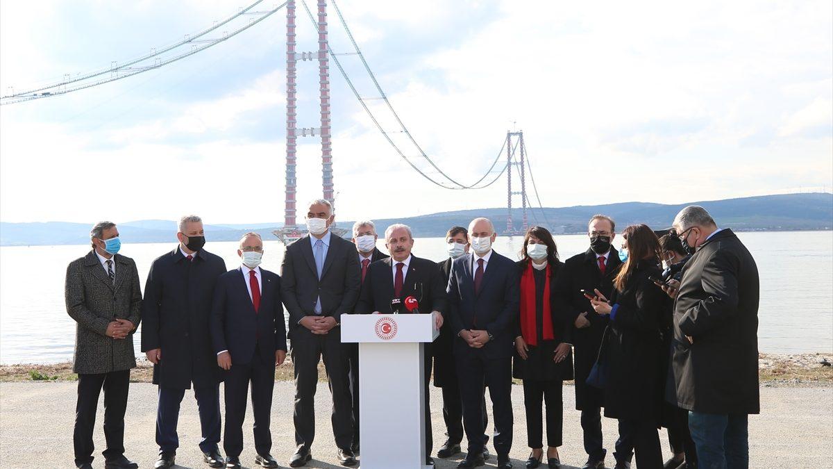 Köprüyle ilgili incelemelerine değinen Şentop, "318 metre yüksekliğindeki köprü ayağının en üstüne çıktık. İnşallah 18 Mart 2022'de köprü açılmış olacak. Yani sadece geçmişi, ecdadımızı yad ederek değil, bugüne ve geleceğe çok nadide, harikulade eserler bırakarak da ilerliyoruz. Bu köprünün özelliği, dünyada iki ayak arası en geniş olan köprü olacak faaliyete geçtiği zaman. Çalışan işçilere, mühendislere, emeği geçen Ulaştırma ve Altyapı Bakanımıza, daha önceki bakanlarımıza ve tabii bütün bu kıymetli eserler için liderlik yapan Cumhurbaşkanımız Sayın Recep Tayyip Erdoğan'a teşekkür ediyorum." dedi.