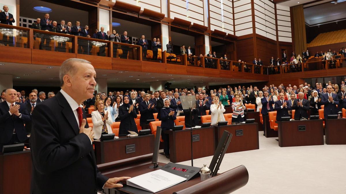 TBMM'deki tören, Atatürk Anıtı'na çelenk konulmasıyla başladı. TBMM Başkanı Mustafa Şentop, Genel Kurul'da birleşimi açıp sunuş konuşmasını yaptı. Şentop, Başkan Recep Tayyip Erdoğan'ı Genel Kurul'a takdim etti.