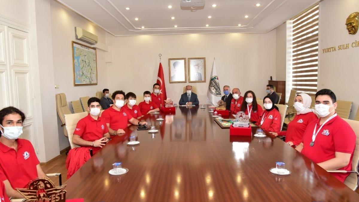 TEKNOFEST 2020’de dereceye giren öğrenciler İl Milli Eğitim Müdürü Mustafa Dikici ve öğretmenleri eşliğinde Manisa Valisi Yaşar Karadeniz’i ziyaret etti. Öğretmen ve öğrencileri tebrik eden, başarılarının artarak devam etmesini temenni eden Vali Karadeniz, öğrencilere çeşitli hediyeler verirken öğretmenlere de Başarı Belgesi verdi.
