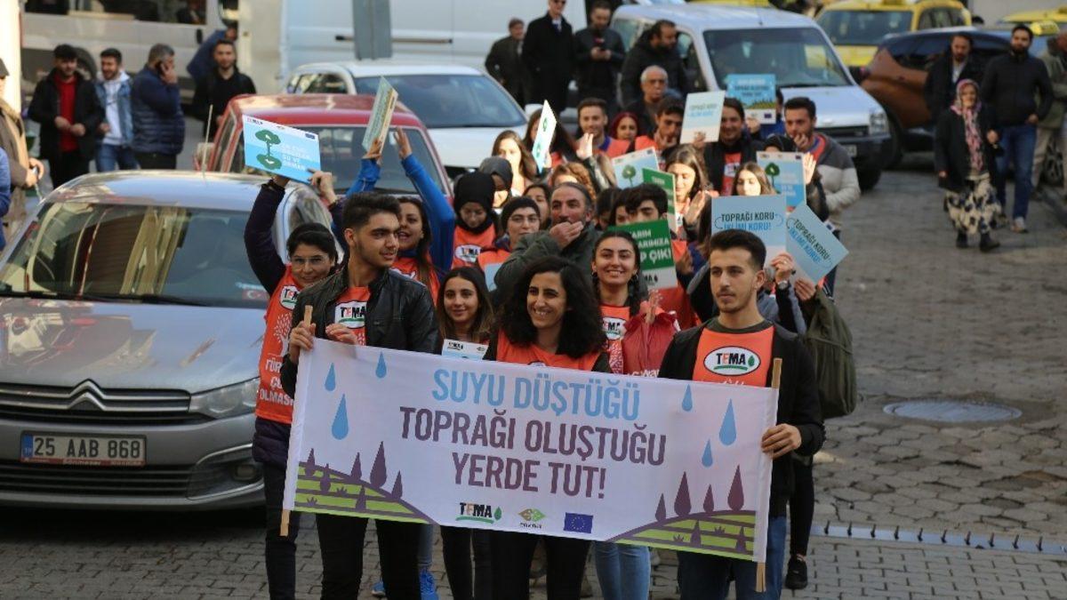 Atapark önünde toplanan TEMA vakfı üyeleri, ‘tarım alanlarına sahip çık’,’ toprağı koru iklimi koru’,’ suyu düştüğü yerde toprağı oluşturduğu yerde tut’, yazılı pankartlarıyla Cumhuriyet caddesi üzerinden slogan atarak Halitpaşa meydanında yürüdü. Burada tekrar toplanan grup basın açıklaması gerçekleştirdi. Basın açıklamasını Genç TEMA üyesi Gizem Kalın okudu. Toprağın ve suyun yaşamın sürmesi için değerli olan iki varlık olduğuna vurgu yapan Genç TEMA Vakfı üyesi Kalın, “Toprak ve su yaşamın iki temel kaynağıdır. Bitkisel üretim ve gıda güvencesi için toprak ve suya birlikte ihtiyaç duyuluyor. Ancak bu iki doğal varlık, uygun koşullarda bir araya gelmediğinde erozyon sorunu ortaya çıkıyor. Yağışla toprağa düşen su eğimli arazilerde hızla akarak toprağı taşıyor. Eğer toprağın yüzeyi ağaç ve bitki örtüsü ile kaplı değilse akan su, toprağın en verimli olan üst kısmını da beraberinde götürüyor. Erozyonla toprağın en verimli kısmı olan üst toprak kaybediliyor. Toprağın verimliliği ve sunduğu hizmetler azalıyor. Zamanla üzerinde bitki tutunamaz hale geliyor. Tüm bunlar insanların ve diğer birçok canlının gıda ve su ihtiyacının karşılanması açısından büyük risk oluşturuyor. Toprağı koruyan uygulamalar, yağışlar nedeniyle toprağın taşınmasının yani erozyonun şiddetini azaltıyor. Bu bakımdan ’Suyu düştüğü, toprağı oluştuğu yerde tut’ diyerek alınması gereken önlemlere dikkat çekiyoruz” ifadelerini kullandı.