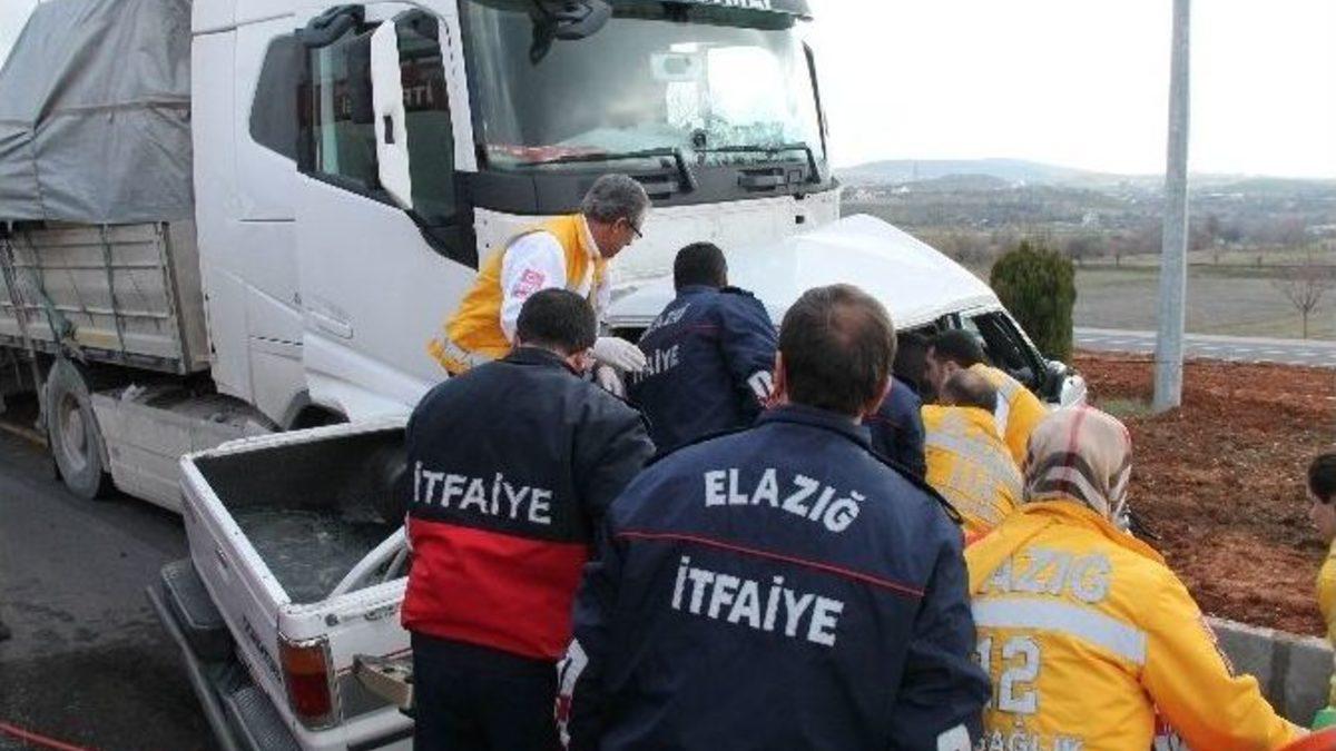 Elazığ’da, bir TIR’ın çarptığı kamyonetteki dört kişi hayatını kaybetti.Kaza, Elazığ Güney Çevre yolunda meydana geldi. Diyarbakır istikametinden Malatya istikametine giden 62 AD 541 plakalı TIR, ara yoldan çevre yola çıkan 23 EH 438 plakalı kamyonete çarptı. Kazada, kamyonette bulunan 4 kişi hayatını kaybetti. Olay yerine ilk ulaşan sağlık ekipleri levye ile sıkışan kapıları açmaya çalıştığı sırada itfaiye ekipleri geldi. İtfaiye ekipleri, dört kişinin cesedini kamyonetten çıkardı.TIR sürücüsü, polis tarafından gözaltına alındı.
