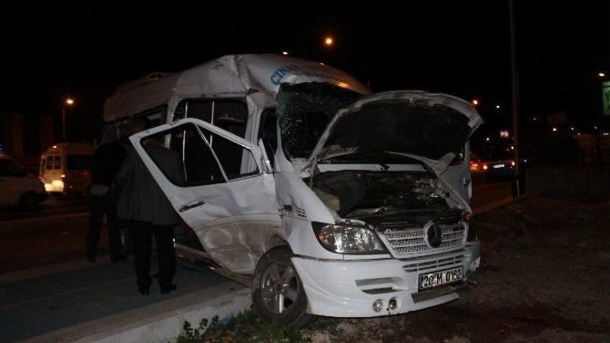 Denizli’de kırmızı ışıkta bekleyen minibüse bir TIR’ın çarpması sonucu meydana gelen kazada 17 kişi yaralandı.Kaza, akşam saatlerinde Acıpayam-Denizli yolu üzerinde bulunan Bağbaşı Mahallesi’nde meydana geldi. Kırmızı ışıkta bekleyen Abdülkadir B. yönetimindeki 20 M 0162 plakalı minibüse, arkasından gelen A.D. idaresindeki 01 BUM 72 plakalı TIR hızla çarptı. Çarpmanın etkisiyle minibüs yoldan çıkarak karşı şeride geçerken, şoför aracı güçlükle durdurabildi. TIR ise Habibe Güneşler yönetimindeki 20 AKF 24 plakalı otomobile de çarparak yan şeride geçerek durdu. Kazayı görenler durumu polis ve sağlık ekiplerine bildirdi. Kısa sürede kaza yerine gelen polis ekipleri yolu trafiğe kapatırken, sağlık ekipleri de kaza yerine gelerek yaralılara müdahale etmeye başladı. Özellikle minibüste bulunan yaralılara ilk müdahaleyi olay yerinde yapan sağlık ekipleri, yaralılarla konuşarak bilinçlerini açık tutmaya çalıştı. Çok sayıda ambulans kaza yerine gelerek yaralıları alırken, yaralılar Pamukkale Üniversitesi Hastanesi, Denizli Devlet Hastanesi ve diğer özel hastanelere kaldırıldı.Polis ekipleri yolu trafiğe açabilmek için çaba harcarken, kazayı merak edenler polis ekiplerine zor anlar yaşattı. Kazada otomobili kullanan Habibe Güneşler, TIR’ın kendilerine çarpmasıyla neye uğradıklarını şaşırdığını belirterek, “Ben yan yoldan çıkıyordum. Sağa dönecektim. TIR bir anda bize çarptı” dedi.Kazanın ardından polis ekipleri güvenlik kameralarını incelerken, görüntülerde TIR’ın minibüse hızla çarpması görülüyor. Kazayla ilgili soruşturma sürerken, yaralıların sağlık durumunun ciddi olmadığı öğrenildi.