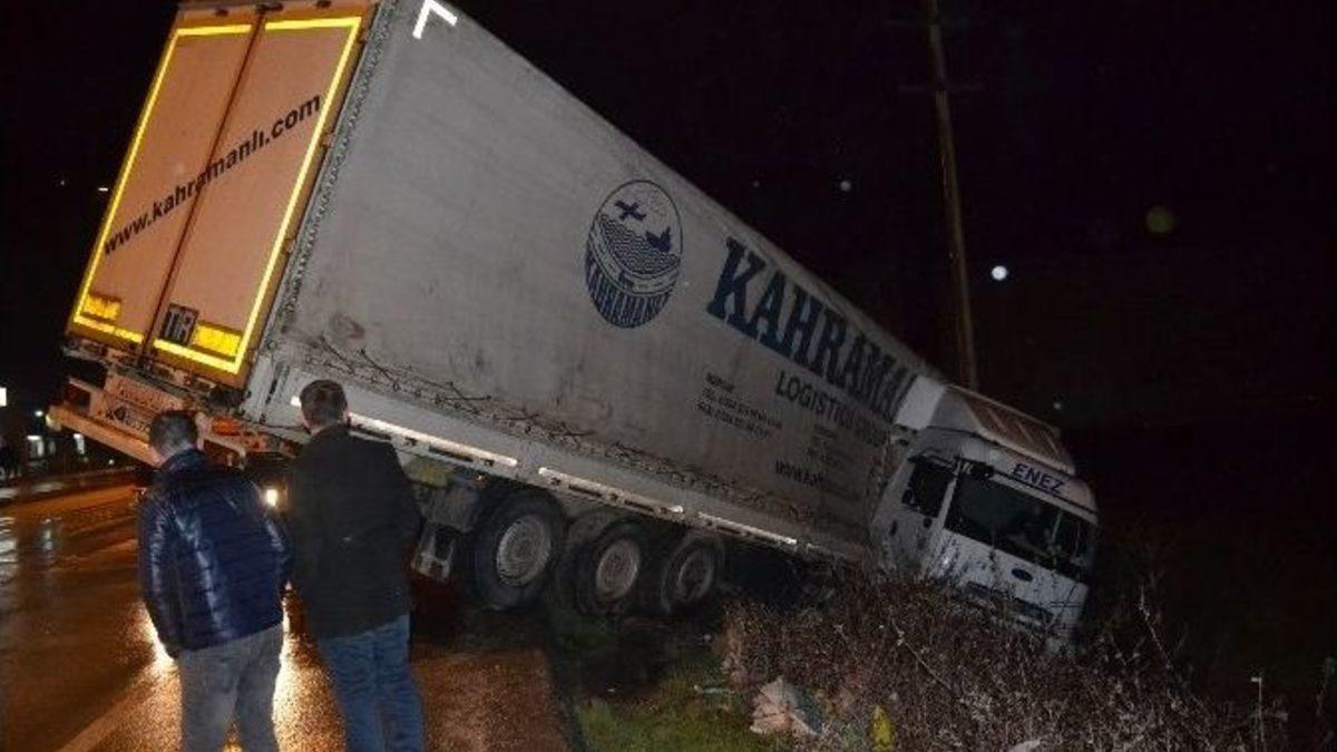 Bursa-Ankara karayolunda yağmur nedeniyle kayganlaşan yolda kayan TIR tarlaya uçtu. Sürücünün yara almadığı kazada TIR uzun uğraşlar düştüğü yerden kaldırıldı.Edinilen bilgilere göre, Ankara’dan Bursa istikametine seyir halinde olan sürücü Ali Ataş yönetimindeki 59 PU 376 çekici, 33 BDK 37 dorse plakalı TIR, İnegöl girişi Kaplan Petrol mevkiine geldiği sırada, yağmurdan dolayı kayganlaşan yolda kontrolden çıkarak yolun sağından tarlaya uçtu. TIR’ın çekici kısmı tarlaya uçarken, dorse kısmı karayolu üzerinde havada asılı kaldı.KURTARMA ÇALIŞMALARI SAATLER SÜRDÜTIR sürücüsü kazayı yara almadan atlatırken, TIR’ın dorse kısmının yolu kısmen kapatması nedeniyle Ankara’dan Bursa istikametine trafik akışı aksadı. Kaza yerine gelen kurtarıcının gücü, TIR’ı kurtarmaya yetmeyince, kaza yerine iki adet kurtarıcı ve vinç daha çağrıldı. TIR büyük uğraşlar sonucu kurtarılan, kurtarma çalışmaları nedeniyle trafik akışı tamamen durdu, uzun araç kuyruğu oluştu. Bazı sürücü ve yolcular ise, kurtarma çalışmalarını araçlarından inerek izledi.