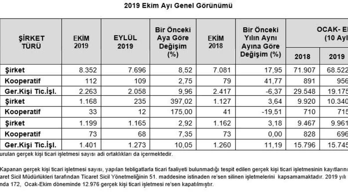 Yılın ilk 10 ayında 2018 yılının aynı dönemine göre kapanan şirket sayısı yüzde 5.52 artarken, kapanan gerçek kişi ticari işletme sayısı yüzde 0.32 kapanan kooperatif sayısı yüzde 15.94 azaldı.