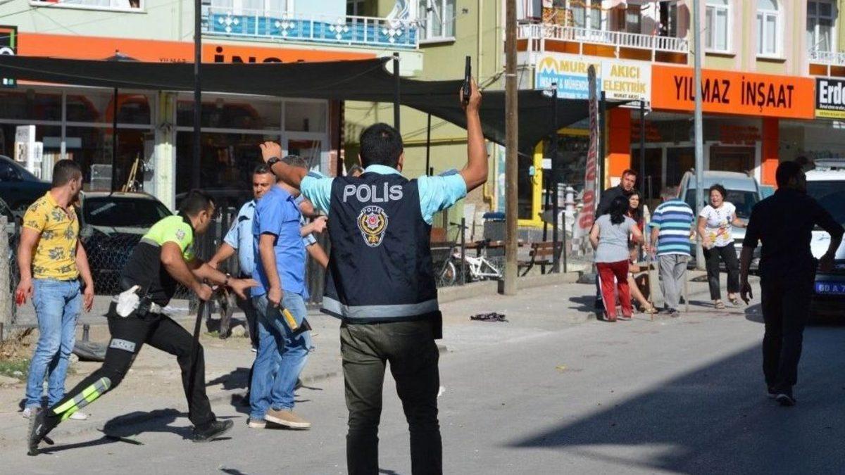 Tokat’ın Niksar ilçesinde alacak verecek meselesi yüzünden çıktığı iddia edilen kavgada 1’i polis 11 kişi yaralandı.Olay, saat 16.30 sıralarında Cumhuriyet Caddesi üzerinde meydana geldi. İddiaya göre, alacak verecek meselesi yüzünden iki grup arasında kavga çıktı. Kavganın ihbar edilmesinin ardından olay yerine polis ekipleri sevk edildi. Taş, sopa ve silahın kullandığı kavgayı ayırtmak da polis yetersiz kalınca havaya ateş açtı. Daha sonra kavgada yaralananlar için olay yerine ambulans sevk edildi. İlçe Jandarma Komutanlığına ekiplerde olay yerine geldi. Tokat’tan takviye olarak özel hareket timleri ve çevik kuvvet ekipleri de olay yerine gönderildi. Kavgada yaralanan bazı şahıslar çevrede bulunan marketlere sığındı.Öte yandan kavgaya karışan bazı kişilerin elinde balta olması dikkat çekti. Kavgada yaralanan 1’i polis 11 kişi Niksar Devlet Hastanesi’ne kaldırıldı. Polis kavganın ardından çevrede geniş güvenlik önlemi alarak caddeyi trafiğe kapattı. Olayla ilgili inceleme başlatıldı.