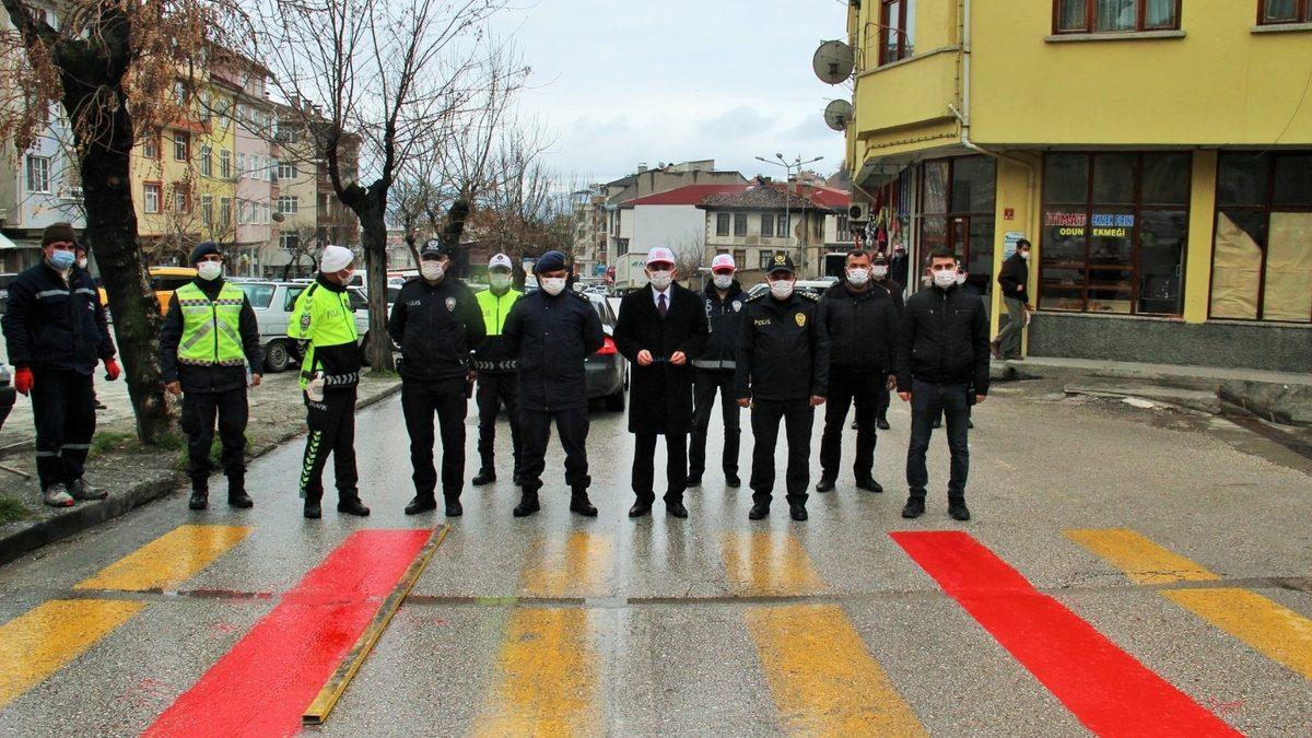 Kastamonu’nun Tosya ilçesinde ‘Yayalar Kırmızı Çizgimiz’ uygulaması kapsamında okul geçidine kırmızı çizgi çizildi.