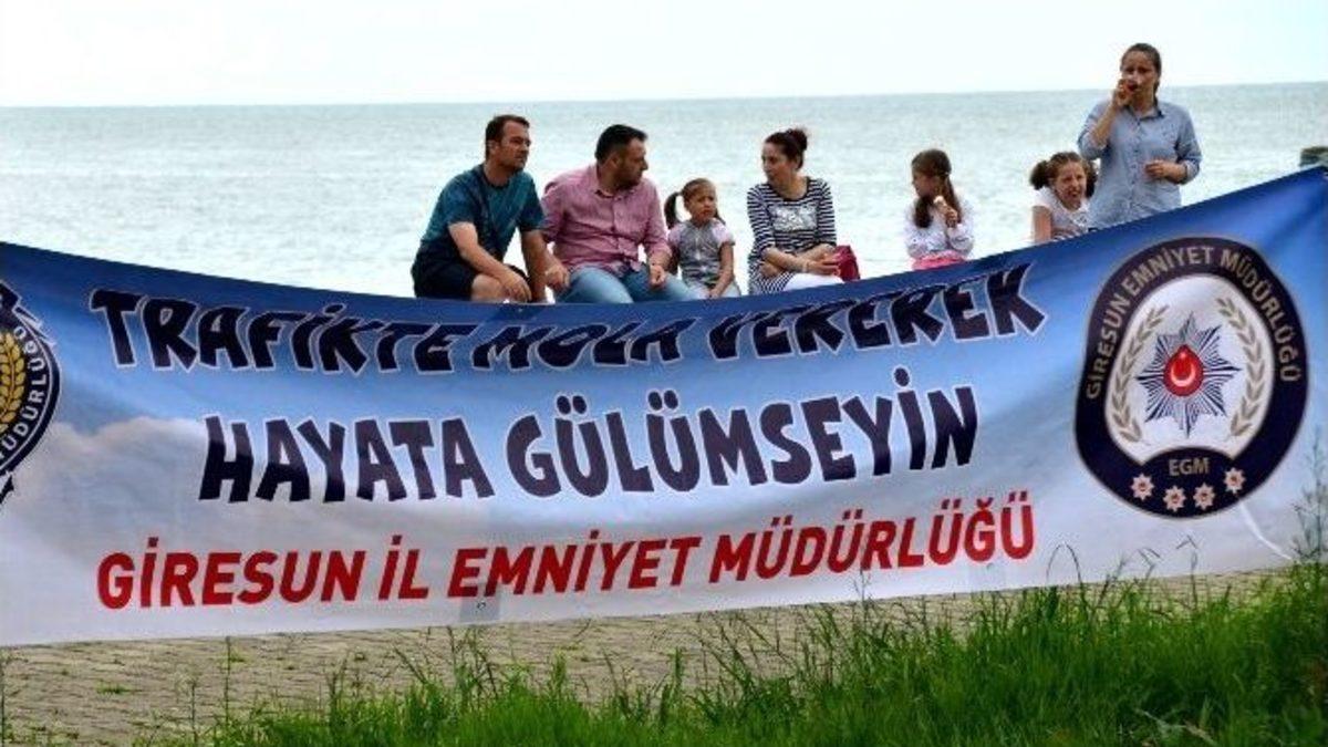 Giresun İl Emniyet Müdürlüğü tarafından Ramazan bayramında “Trafikte Mola Vererek Hayata Gülümseyin” projesi kapsamında sürücülere broşür dağıtılarak, ikramda bulunuldu. Giresun İl Emniyet Müdürü Uğur Öztürk, “Bayram dönüşlerini vatandaşlarımızın can ve mal kayıplarıyla sonuçlanmasını istemiyoruz” dedi.Türkiye genelinde bayram tatilinin uzun olması nedeniyle yollarımızda özellikle ana arterlerde yoğun trafik olduğunu takip ettiklerini belirten Emniyet Müdürü Uğur Öztürk, “Bu süre içerisinde ilimizden geçen Karadeniz sahil yolunda bayramdan önceki Cuma günü başlayıp bugünde devam ettirdiğimiz ve yarın sonlandıracağımız, ‘trafikte mola verin hayata gülümseyin’ projesi bu bayramda da maksadına ulaşmıştır” şeklinde konuştu.Öztürk açıklamasını şöyle sürdürdü:“Buradan yolu kullanan sürücülere sesleniyorum: insan hayatı her türlü acelenin üzerinde ve kıymetlidir. Ulaşmak istediğiniz yere bir an önce ulaşmak istediğinizi biliyoruz. Aynı güzergahları bizlerde kullanıyoruz. Trafik kurallarına riayet edersek, yolda uygulamada bulunan personelimizin ikaz ve işaretlerine riayet edersek inanın ulaşmak istediğiniz noktaya daha çabuk, daha erken ve zinde ulaşırsınız. Biz bayram günlerinin mateme dönüşmesini istemiyoruz. Bayram dönüşlerini vatandaşlarımızın can ve mal kayıplarıyla sonuçlanmasını istemiyoruz. Bundan sonraki bayramlarda bu güzergahlarda bu uygulamayı devam ettireceğiz”.Uygulamanın sürücüler açısından çok güzel olduğunu değerlendiren sürücüler ise “Bu sayede dikkati dağılan sürücüler mola ile kendilerine geliyorlar. Uygulama 300-350 kilometrede bir olmalı. Her 4 saatte bir sürücüler istirahat etmiş ve bu sayede trafik kazalarının da önüne geçmiş olurlar” dedi.Bölge Trafik Denetleme Şube Müdürlüğü ekiplerince, Ramazan Bayramı trafiğinin başladığı 2 Temmuz Cumartesi günü uygulamaya konulan proje kapsamında Trabzon İstikameti Keşap Otogar mevkisinde, Ordu İstikameti İl Emniyet Müdürlüğü karşısı TIR parkında ‘Mola’ uygulaması yapıldı.Mola noktalarında uzun yol sürücülerine Broşür dağıtımı ve Çay İkramı yapılarak, mola vermeleri ve dinlenmeleri istendi.