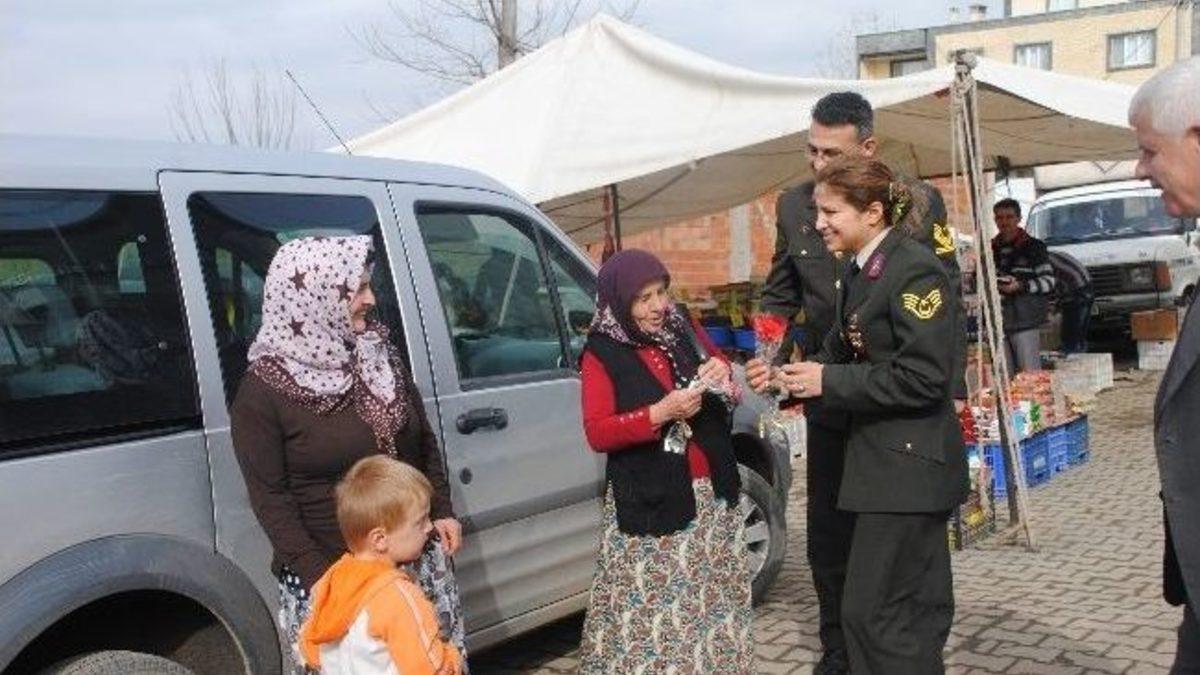 Samsun İl Jandarma Komutanlığı Çocuk ve Kadın Şube Kısım Amirliği ile Çarşamba İlçe Jandarma Komutanlığı’ndan oluşan ekip, köyleri gezerek kadınların “8 Mart Dünya Kadınlar Günü”nü kutladı.İl Jandarma Komutanlığı’ndan Çarşamba'ya gelerek 8 Mart Dünya Kadınlar Günü nedeniyle köylerdeki bayanların günlerini kutlamak isteyen personellere, İlçe Jandarma Komutanı ve personelleri de eşlik etti. Kadınların da bulunduğu askerler, Çarşamba'nın köylerini gezerek yol üzerinde, pazar yerlerinde ve evlerinde ziyaret ettikleri kadınlara karanfil ve çeşitli hediyeler vererek günleri kutladılar.Kadın ve erkek askerleri karşılarında görünce şaşıran kadınlar, ziyaretlerinden dolayı onlara teşekkür ettiler.