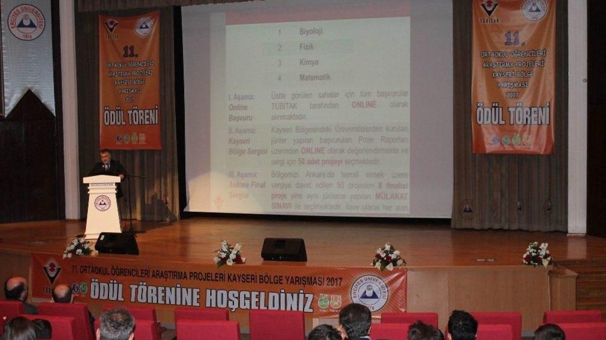 TÜBİTAK 11. Ortaokul Öğrencileri Araştırma Projeleri Kayseri Bölge Yarışması ödül töreni yapıldı.Erciyes Üniversitesi (ERÜ) Sabancı Kültür Sitesinde gerçekleştirilen ödül törenine, ERÜ Rektör Yardımcısı Prof. Dr. Kemal Apalak, Nuh Naci Yazgan Üniversitesi Rektörü Prof. Dr. Kerim Güney, TÜBİTAK Kayseri Bölge Koordinatörü Prof. Dr. Sebahattin Ünalan, Milli Eğitim İl Müdür Vekili Mehmet Ulusoy, Kocasinan İlçe Milli Eğitim Müdürü Yaşar Öztürk katıldı.Programın açılış konuşmasını yapan ERÜ Rektör Yardımcısı Prof. Dr. Kemal Apalak, genç nüfus bakımından Batı ülkelerine göre şanslı olan Türkiye’de, gençlerin daha özgüvenli yetişebilmeleri açısından bu tür yarışmaların önemli olduğunu ifade etti.Erciyes Üniversitesi olarak böyle bir yarışmaya ev sahipliği yapmaktan dolayı onu duyduklarını dile getiren Prof. Dr. Kemal Apalak, “Ülkemiz bulunduğu coğrafya itibariyle gerek Asya, gerek Afrika gerekse Avrupa ile iletişim içinde olan bir konuma sahip. Sürekli olarak bize teknoloji ve bilimde önde olduğu ifade edilen bir Batı medeniyeti ile geride bıraktığımız bir Doğu medeniyeti ve şu anda kendini ifade etmeye çalışan Afrika ülkeler topluluğu var. Batı’ya baktığımızda genç nüfus oranının daraldığını ve diğer ülkelerden insan ithal ederek, insan gücü oluşturmaya çalıştıklarını görüyoruz. Bizde ise çok gen iş bir genç nüfus var ve dolayısıyla uzun bir mücadelemiz var. İnsana yapılan yatırım en büyük ve en zor yatırım. Hepimizin bildiği gibi insanoğlunun öğrenme süreci ölümüne kadar devam ediyor, bu öğrenme kendi kendine olabileceği gibi, eğitmenler aracılığı ile de desteklenebilir. Aileden başlayan ve okul sürecinde devam eden eğitimin belli bir sistem içerisinde ve ülkenin önündeki beklentilere, hedeflere hizmet etmesi gerekiyor. Ülkelerarası insan gücüne baktığımızda, insan gücünün ülkesini temsil etmesi için donanımlı olmanın yeterli olmadığını, özgüvene sahip olmanın gerekliliği ön plana çıkıyor. Bu tür proje ve yarışmalar, gözümüzün nuru olan gençlerimizin, çekirdekten özgüven ve kendilerini ifade etme gücü kazandırıyor” diye konuştu.Ortaokul öğrencilerine TEOG’dan ek puan müjdesiTÜBİTAK Kayseri Bölge Koordinatörü Prof. Dr. Sebahattin Ünalan ise, bu yıldan itibaren TÜBİTAK koordinatörlüğüne devredilen yarışmanın daha önce Milli Eğitim Bakanlığı tarafından, ‘Bu benim eserim’ logosu ile düzenlendiğini belirtti. Bundan sonraki yıllarda yarışmada bir takım değişiklikler yapılacağını kaydeden Prof. Dr. Sebahattin Ünalan, liselerarası yarışmalarda dereceye giren öğrencilere üniversite yarışmalarında ek puan verildiği gibi, ortaokul öğrencilerinin de TEOG’dan ek puan alması için benzer bir çalışma yaptıkları müjdesini verdi.Konuşmaların ardından, dereceye giren öğrencilere ve öğretmenlerine ödülleri takdim edildi.