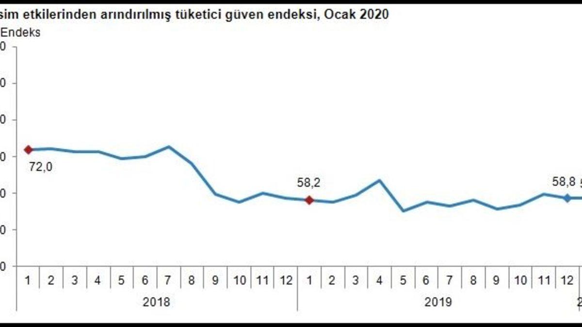 Türkiye İstatistik Kurumu (TÜİK) ve Türkiye Cumhuriyet Merkez Bankası işbirliği ile yürütülen tüketici eğilim anketi sonuçlarından hesaplanan mevsim etkilerinden arındırılmış endeks geçen yılın aynı ayında ise 58.2 düzeyindeydi.