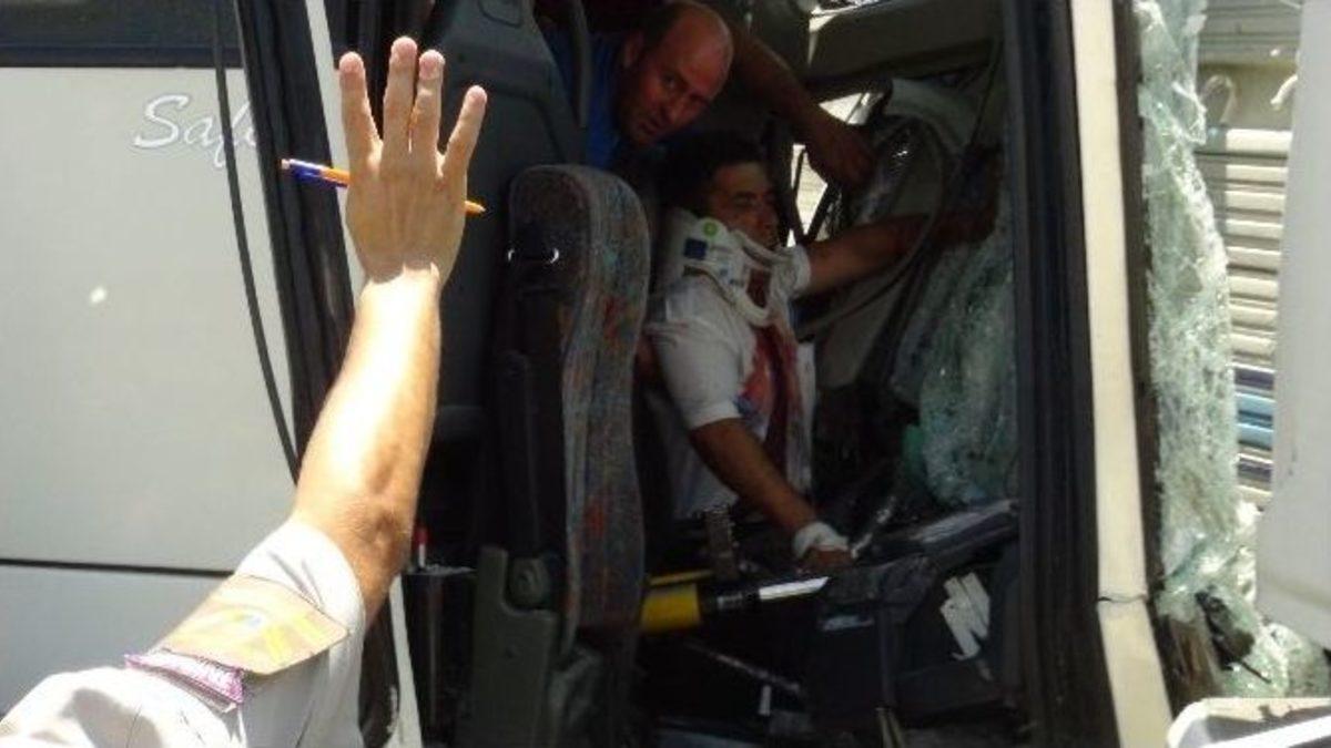 Antalya’nın Manavgat ilçesinde tur otobüsünün otomobil ve kamyona çarpması sonucu meydana gelen kazada, otobüste sıkışan şoför yaklaşık 2 saatlik çalışmayla kurtarıldı.Alanya’dan Antalya Havalimanı’na turistleri götüren Abdullah Öztürk yönetimindeki tur otobüsü, Alanya-Antalya D-400 karayolu Taşağıl kavşağında kırmızı ışıkta bekleyen İbrahim Altay idaresindeki 07 EUC 23 plakalı otomobile sol tarafından çarptı. Kırmızı ışıkta geçen otobüs daha sonra Antalya istikametinden Taşağıl Orman İşletmesi’ne gitmekte olan Mesut Eroğlu idaresindeki 07 YOJ 97 plakalı kamyona yandan çarptı. Otobüsün sürükleyerek yoldan çıkardığı kamyonda bulunan 4 kişiden 2’si, çarpmanın şiddetiyle kamyondan dışarı fırladı. Kazada otobüs sürücüsü Abdullah Öztürk bulunduğu yerde sıkışırken, kamyon sürücüsü Mesut Eroğlu, kamyonda bulunan Serdar Gök, Ali ve Kemal Gökçe, tur rehberi Hayri Atıç ile otomobil sürücüsü İbrahim Altay yaralandı. Serdar Gök’ün gözünün çıktığı ve Akdeniz Üniversite Hastanesi’ne kaldırılarak ameliyata alındığı bildirildi. Diğer yaralılar Manavgat ve Serik’te bulunan hastanelere kaldırılırken, hafif yaralanan otomobil sürücüsü İbrahim Altay’a olay yerine gelen sağlık ekibi tarafından müdahale yapıldı. Tur otobüsünde bulunan ve Alanya’daki otellerde tatil yaptıktan sonra ülkelerine gitmekte olan 45 turistin kazada burnunun bile kanamadığı, kazanın ardından bir başta otobüsle Antalya Havalimanı’na götürüldüğü bildirildi.Otobüste sıkışan şoförün kurtarılması için adeta seferberlik ilan edildi. Antalya Büyükşehir Belediyesi itfaiye ekipleri ve kurtarıcılar yardımıyla ilk aşamada otobüsün çarptığı kamyon otobüsten ayrılırken, yaklaşık 2 saatlik bir çalışmanın ardından otobüs şoförü sıkıştığı yerden çıkarılarak hastaneye kaldırıldı.Kurtarma çalışması sırasında kaza yerine toplanan kişilerin cep telefonlarıyla fotoğraf ve görüntü çekmeye çalışmaları, kurtarma yapan ekibe ve güvenlik güçlerine zor anlar yaşattı.