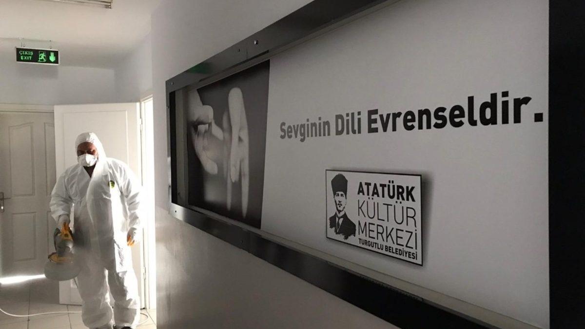 Korona virüs salgınına karşı halk sağlığının korunması için kapanan, normalleşme sürecinin başlamasıyla birlikte faaliyetlerine yeniden başlayan merkez ve işletmeler ile hizmetlerine ara vermeden devam eden alanların dezenfekte çalışmaları Temizlik İşleri Müdürlüğü ekipleri tarafından yürütülüyor. Çalışmalar kapsamında faaliyetlerine iki buçuk aydır ara veren Turgutlu Eğitim Destek Kurs Merkezi (TURBEM), Atatürk Kültür Merkezi, Turgutlu Kent Müzesi, Nurgül Fidan Yüzme Havuzu, Dosteli Kıyafet Yıkama ve Teslim Merkezleri, Ortapark ve Kozapark dezenfekte edildi. Korona virüs salgını boyunca hizmet ve çalışmalarına aralıksız devam eden Turgutlu Belediyesi Hizmet Binası, Aşevi ve Hayır Merkezi, Turgutlu Belediyesi Nikah Salonunun dezenfekte çalışmaları da yapıldı.