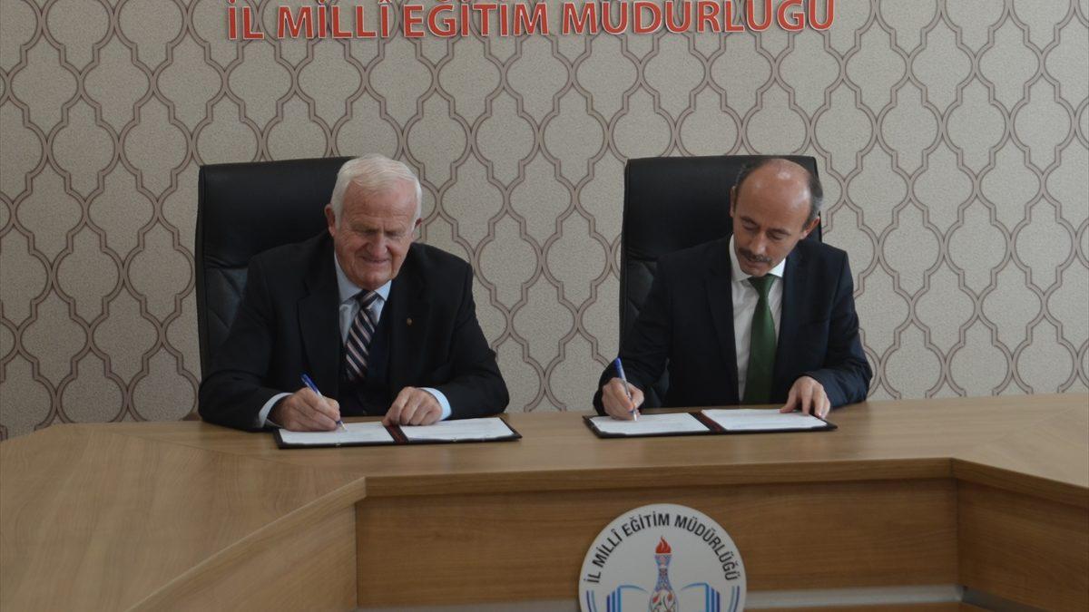 Protokolün imzalanmasının ardından Erk, Sarıöz'e eğitimlerde kullanılacak kitap ve materyalleri takdim etti.
