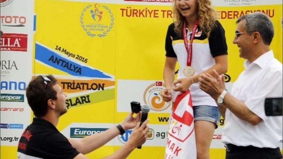 Türkiye Triatlon Federasyonu Antalya Triatlanu ve Duatlonu sona erdi. Ödüllerin verildiği sırada Türkiye ve Balkan Şampiyonu Ece Bakıcı’ya sevgilisi sahnede evlenme teklif etti.Türkiye Triatlon Federasyonu’nun faaliyet programındaki puanlı ilk yarışları Antalya Triatlonu ve Duatlonu yarışları 508 sporcunun rekor katılımıyla gerçekleşti. Sabah 8.00’da başlayıp tüm gün süren yarışmalarda çocuk, genç yaşlı, kadın erkek her yaş grubundan yüzlerce sporcu deniz, bisiklet ve koşudan oluşan zorlu parkuru tamamlamak için kıyasıya ter döktü. Renkli görüntülere de sahne olan yarışmaların finali de yine aynı renklilikle gerçekleştirildi. Antalya Vali Yardımcısı Mestan Yayman, Antalya Büyükşehir Belediye Başkanı Yardımcısı İsmail Afşar, Gençlik ve Spor İl Müdürü Burhanettin Hacıcaferoğlu, Türkiye Triatlon Federasyonu Başkanı Hamdi Güneş ve ödül alan sporcular ile yakınlarının katılıyla gerçekleştirilen ödül töreninde dereceye giren sporcular madalyalarını protokolden teslim aldı.SÜRPRİZ EVLENME TEKLİFİ1500 metre yüzüp, 20 km bisiklet ve 10 kilometre koşudan oluşan elit yarışların bayanlar kategorisine Balkan ve Türkiye Şampiyonu Ece Bakıcı tek başına katılarak 00 39 10’luk derecesi ile birinci oldu. Elit Erkekler kategorisinde ise Ali Mutlu kazandı. Ece Bakıcı’ya madalyasını Antalya Vali Yardımcısı Mestan Yayman verdi.Genç sporcu Bakıcı, sahneden inmeden bir sürpriz daha yaşayarak mutluluğunu ikiye katladı. 8 yıldır devam eden ilişkiyi mutlu bir sonla birleştirmek isteyen Onur Calp, sevgilisi Ece Bakıcı’nın yanına gelip diz çöktü ve cebinden çıkardığı tek taş yüzük ile evlenme teklif etti. Duygulandığını belirten Bakıcı “8 yıldır bu anı bekliyordum. 8 yıl beklemişim biraz daha mı beklesem acaba?” dedikten sonra teklife evet yanıtını verdi. Sahnede gerçekleşen ani teklife şaşırdığını belirten Antalya Valisi Yardımcısı Mestan Yayman da sporun birleştirici gücünü gördüklerini belirterek, çiftin nikah şahidi olmak istediğini belirtti.Tören daha sonra derece alan sporcuların ödüllerinin takdimi ve toplu fotoğraf çekiminin ardından sona erdi.DERECEYE GİRENLERTüm gün devam eden yarışmalarda dereceye giren ilk 3 isim ise şöyle:Minik Erkekler1. Emir Aracı2. Barboros Zorlu3. 3 Hakan TunçMinik Kızlar1. Başak Saatli2. 2. Yaren Nur Çağsan3. Eylül EravcıYıldız Erkekler1. Enes Kızılcık2. 2. Baran Aktan3. Muzaffer GürYıldız Kızlar1. Bilge Ece Seyhan2. Birsu Ulkat3. Görken Sıla KorkmazGenç bayanlar (A)1. Elif Polat2. 2. Aybüke Sen3. Gözde Nur GüvenbaşGenç Bayanlar (B)1. İlayda Kara2. Sinem Özdil3. Buse AygünGenç Erkekler (A)1. Oktay Arıkan2. Hüseyin Hallaç3. Semih ErdikGenç Erkekler (B)1. Gültigin Er2. Emirhan Altıntaş3. Arda TümerBayan-Erkek yaş gruplarında alınan sonuçlar şöyle:+19 erkekler1. Kemal Elektrikçi2. Ali Can Andaç3. Mehmet Korkut+ 19 Bayanlar1. Emine Uluçay2. Seher Kocatepe3. Esin Akkartal+25 Erkekler1. Barış İlhan2. Volkan Odak3. Gürsel Yazar+30 Erkekler1. Dinçer Yılmaz2. Bahadır Tama3. Kemal Çobanyıldızı+30 Bayanlar1. Virginie Arslan2. Carole Müller3. Caroline Chapatte+35 Erkekler1. Soner Oralkasım2. Tahsin Özgür3. Erdem Ağbaş+ 40 Erkekler1. Fırat Dizman2. Kutluhan Özkunt3. Ateş Berna+ 45 Erkekler1. Hakan Ulaş2. Mehmet Seçilmiş3. Gökhan Özkorkmaz+ 50 Erkekler1. Martin Benhard2. Hakan Kosacıoğlu3. Mehmet Akarcalı+ 55 Erkekler1. Ayhan Tama2. Sami Noyan3. Aytaç Bilginer+ 60 Erkekler1. Fikret Akay2. Ali Bıdı3. A. Selami Vanlı+ 40 bayanlar1. Ayşin Özer Başkır2. Didem Aksoy3. Cevlan Ertuğrul+ 50 Bayanlar1. Canan Oyma2. Hediye Tama