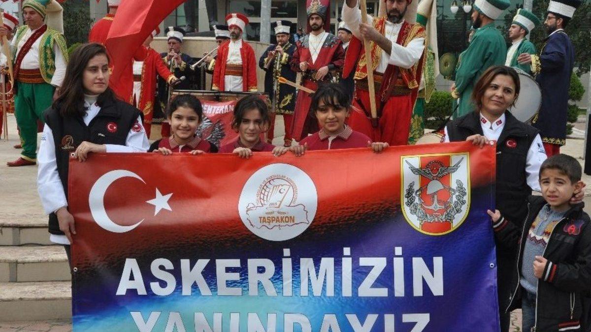 Suriye’nin Afrin kentindeki YPG/PKK hedeflerine yönelik başlatılan Zeytin Dalı Harekatı’na teröristlerin yaptığı misillemeler sonucu çok sayıda roketin hedefi olan ve 4 şehit veren Hatay’ın Reyhanlı ilçesinden Türk askerine destek sürerken, Uşak Mehter Takımı belediye binası önündeki alanda konser verdi.MHP Uşak İl Teşkilatı tarafından organize edilen konsere vatandaşlar da eşlik etti. Konser sonunda konuşan Reyhanlı Belediye Başkanı Hüseyin Şanverdi, Türkiye’nin kalbinin Reyhanlı’da attığını ifade ederek, “Afrin’deki PKK/PYD terör örgütleri tarafından Reyhanlı’ya 52 roket atıldı. Bunlardan 40’ı ilçe merkezine düştü, 4 şehidimiz ve 75 yaralımız var. Başta Zeytin Dalı Harekatı olmak üzere tüm şehitlerimize, Reyhanlı’daki 11 Mayıs’ta şehit olanlara Allah’tan rahmet, yaralı ve gazilerimize şifa diliyorum. Türkiye’nin kalbi Reyhanlı’da atıyor. Reyhanlı ile hep beraber Hatay’da bir ve beraberiz, 81 milyonuz. Zeytin Dalı Harekatı’nın da başarılı olması için Mehmetçiğimize dua ediyoruz, sefer bizden zafer Allah’tan” dedi.MHP Uşak İl Başkanı Muhterem Kuruçay ise yaptığı konuşmada şunları söyledi:“Geçtiğimiz günlerde Reyhanlı halkı sanki kaçıyormuş gibi bir algı oluşturuldu. Dedik ki biz Reyhanlı halkının kaçmadığını, kahraman Türkler gibi topraklarında olduğunu, kaçmayacaklarını ispat etmeye göstermek amacıyla Uşak’tan geldik. Türk kaçmaz Reyhanlılılar kaçmaz, hiç kimse kaçıramaz onları böyle bir şey yok, böyle bir dünya yok. Türk’ün kaçtığı hiçbir yerde görülmemiştir. Reyhanlı halkı yerindedir. Türkiye’nin kalbi Reyhanlı’da atıyor. Uşak’ın kalbi de Reyhanlı’da atıyor. Uşaklılar sonuna kadar Reyhanlı halkının yanındadır. Bunu ispat etmek için buradayız.”Uşak Mehter Takımının Reyhanlı’daki konserine siyasi parti temsilcileri, Uşak ve Tokat’tan gelen vatandaşlar da katıldı.