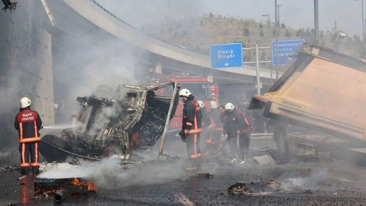 Elazığ’da üst geçitten aşağı düşen kamyonun kabini alev alev yanarken, 2 kişi kazadan yaralı kurtuldu.Kaza, Elazığ Güney Çevre yolu Kekliktepe üst geçidinde meydana geldi. Edinilen bilgiye göre, Erol Sertkaya idaresindeki 06 DR 2650 plakalı hafriyat kamyonu, Malatya istikametinden Bingöl istikametine seyir halindeyken sürücü direksiyon hakimiyetini kaybetti. Kontrolden çıkan kamyon, üst geçidin demir korkuluklarına çarparak aşağı düştü. Kamyonun kasası ters dönerken, kabin de alev aldı. Kamyon sürücüsü ve yanında bulunan bir kişi kazadan yaralı olarak kurtuldu. Çevredekiler, olayı Elazığ Belediyesi İtfaiye Müdürlüğü ve 112 Acil Komuta Merkezine haber verdi. Olay yerine gelen sağlık ekipleri yaralıları ambulanslarla kentteki hastanelere kaldırırken, itfaiye ekipleri de yangına müdahale etti. Yaklaşık yarım saat süren müdahale sonrası yangın tamamen söndürüldü. Polis ekipleri çevre güvenliği alarak, kaza ile ilgili inceleme yaptı.