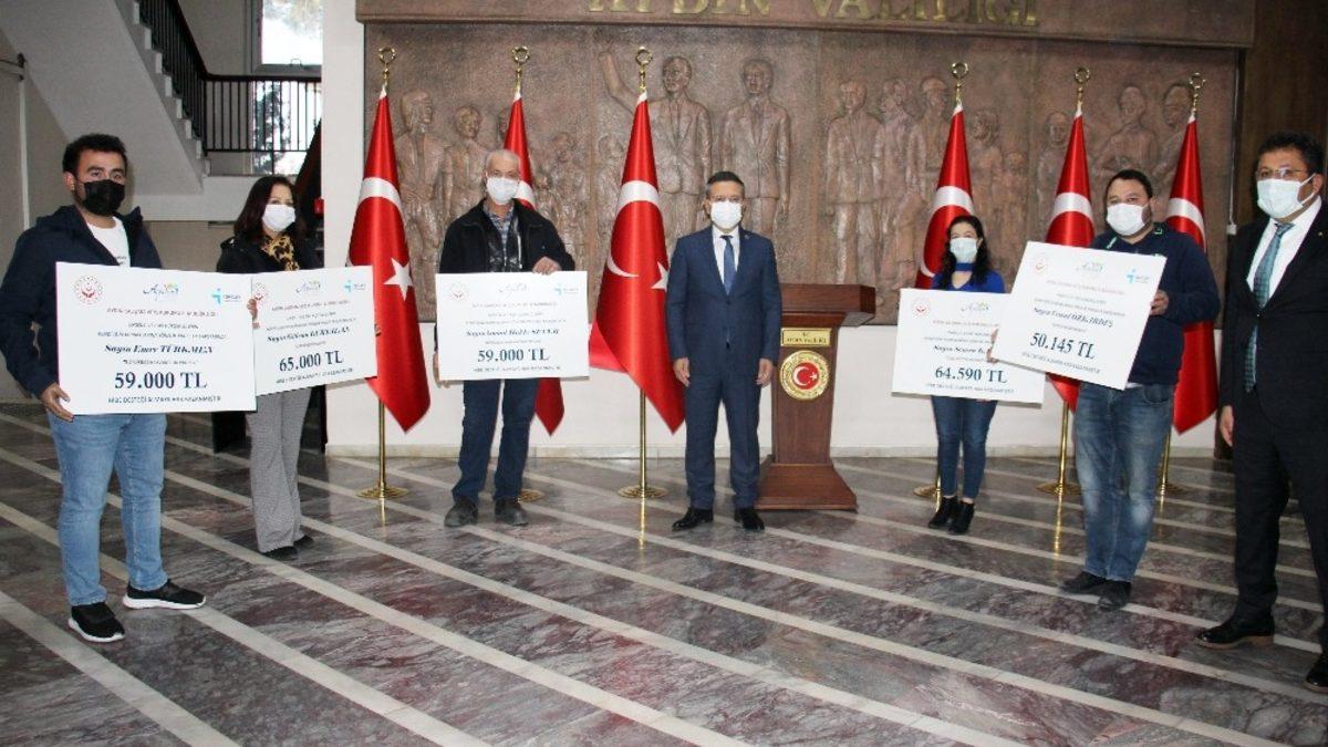 Gerçekleşen konuşmaların ardından Aydın Valisi Hüseyin Aksoy tarafından, Çine’de özel eğitim ve rehabilitasyon merkezi projesi ile Semra Kantek’e 64 bin 590 lira, Çine Evciler Mahallesi’nde büyükbaş hayvancılık yapacak olan İsmail Hakkı Sever’e 59 bin lira, Yenipazar Dereköy Mahallesi’nde büyükbaş hayvancılık yapacak olan Emre Türkmen’e 59 bin lira, Efeler ilçesinde şarküteri market açacak olan Gülcan Kurtalan’a 65 bin lira ve Efeler ilçesinde oto kuaför işletmesi açacak olan Cemal Özkardeş’e 50 bin 145 bin TL’lik hibe çekleri takdim edildi.