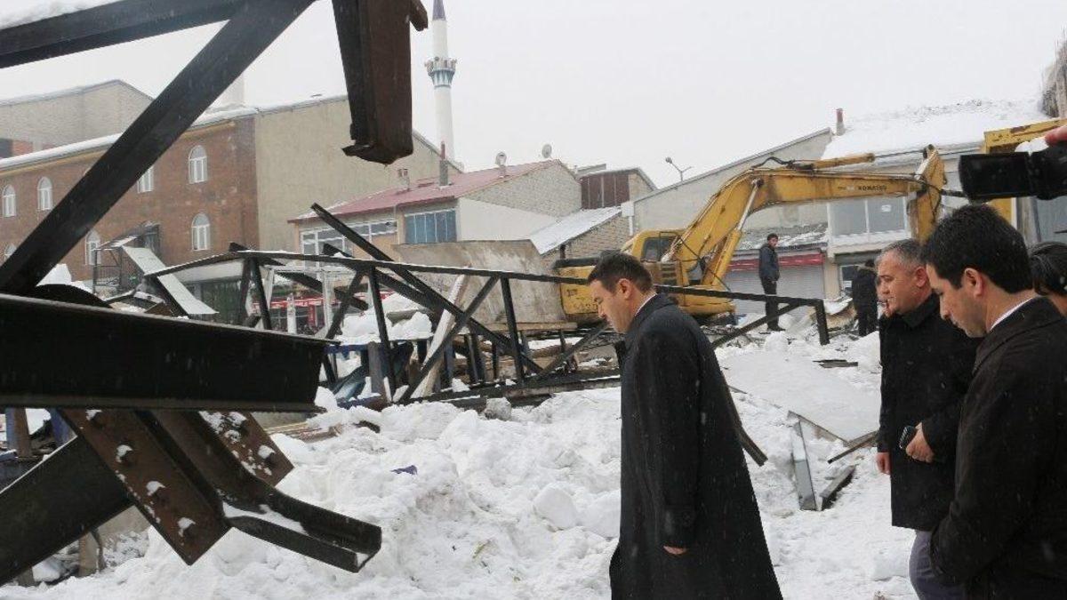 Ağrı Valisi Musa Işın, dün akşam saatlerinde çatısı çöken semt pazarında incelemelerde bulundu.Sebze pazarı esnafıyla görüşen Vali Musa Işın, sabah saatlerinde semt pazarında incelemelerde bulunduktan sonra basın mensuplarına açıklamalarda bulundu. Dün akşam 16.00 sıralarında çatının 6 bin metrekarelik alanının yarısının çöktüğünü, can kaybı ve yaralı olmadığını aktaran Vali Işın, "Enkaz çalışmaları kaldırılmaya devam ediliyor. Bizim en büyük kazancımız can kaybımızın olmamasıdır. İnşallah en kısa zamanda pazarın enkazı da kaldırılıp vatandaşlarımızın mağduriyeti de giderilmiş olur. Bu sene ilimizde yoğun bir kar yağışı oldu. Temizlenmesi gereken kar temizlenmediği için büyük bir baskı oluşturmuş, çökme meydana gelmiş. Hem vatandaş olarak, hemde kurumlar olarak buna karşı tedbirli ve dikkatli olmak gerekiyor. Bende belediyeye gerekli talimatı verdim. Çökmeyen kısmın bir an önce temizlenmesini söyledim. İnşallah kısa sürede hem güvenlik güçlerimiz, hemde AFAD buradaki çalışmasını giderecek, ve bu enkaz ortadan kaldırılacaktır" dedi.