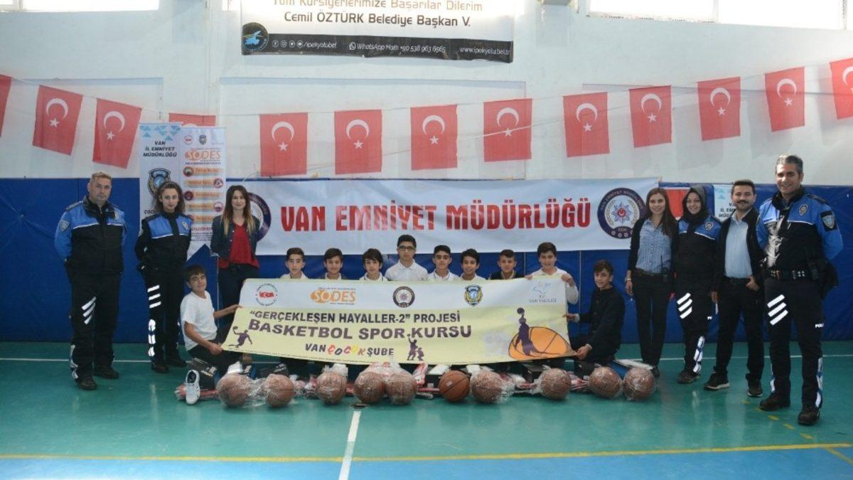 Van Emniyet Müdürlüğü tarafından yürütülen “Gerçekleşen Hayaller-2” isimli proje kapsamında öğrencilere spor malzemesi desteği verildi.