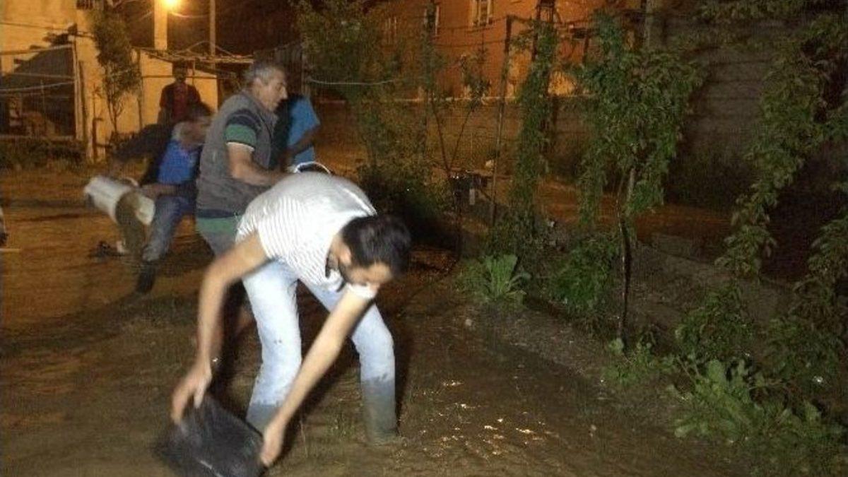 Van’da dün akşam saatlerinde yüksek kesimlerde yağan yağmurdan dolayı derelerin taşması sonucu çok sayıda ev ve işyerleri sular altına kalırken, Büyükşehir Belediyesi ve Devlet Su İşleri (DSİ) Van Bölge Müdürlüğü ekipleri, gece geç saatlere kadar temizleme çalışması yaptılar.Akşam saatlerin Van’ın Doğusu’nda kalan Erdeğ Dağı bölgesinde sağanak yağmurla birlikte derelerin taşması sonucu birçok mahalle, ev ve iş yerleri sular altına kalmıştı. Mahalle sakinleri iftar vakti ev ve işyerlerinin sular altına kalmasıyla sıkıntı yaşarken, evlerinin önlerine set çekmeye çalışarak su baskının önüne geçmeye çalıştılar.DSİ VE BÜYÜKŞEHİR BELEDİYESİ EKİPLERİ GECE GEÇ SAATLERE KADAR TEMiZLİK VE SU TAHLİYESİ YAPTIVatandaşlar, durumu yetkililere bildirmesiyle bölgeye Van Büyükşehir Belediyesi ve Devlet Su İşleri Van Bölge Müdürlüğü ekipleri sevk edildi. DSİ ekipleri, 4 Nolu Sağlık Ocağı’nın yanından geçen ve taşan dere içerindeki kumları temizledi. Onlarca kamyon dolusu kum dereden çıkarıldı. Büyükşehir Belediyesi ekipleri ise yaklaşık 15 araçla temizlik çalışması yürüttü. Çalışmalar gecenin ilerleyen saatlerine kadar devam etti.ÇOK SAYIDA HALI ÇAMURLU SULARIN ALTINDA KALDIİskele Mahallesi içerisinden geçen dere taşınca halı yıkama atölyesi sular altında kaldı. Ramazan Bayram’ına sayılı günler kaldığından yaklaşık 180 adet yıkanmış halı ile iş makineleri çamurlu su altında çalarak yüklü miktarda maddi zarar meydana geldi. İş yeri sahibi Abdulkerim Sarı, taşan dere ile birlikte iş yerinde büyük çapta maddi zarara yol açtığını ifade ederek, "Ramazan Bayar’ıma az bir Zaman kaldı. Bu nedenle çok sayıda yıkanması gereken halı vardı elimizde. Yaklaşık 200 evin halıları çamurlu sular altına kaldı. Bunları yarın teslim edecektik. Şimdi vatandaşlara ne söyleyeceğiz bilmiyorum. Halıların yanısıra halı yıkama makineleri de sular altına kaldı. Şu an ne yapacağımızı bilmiyorum" dedi.