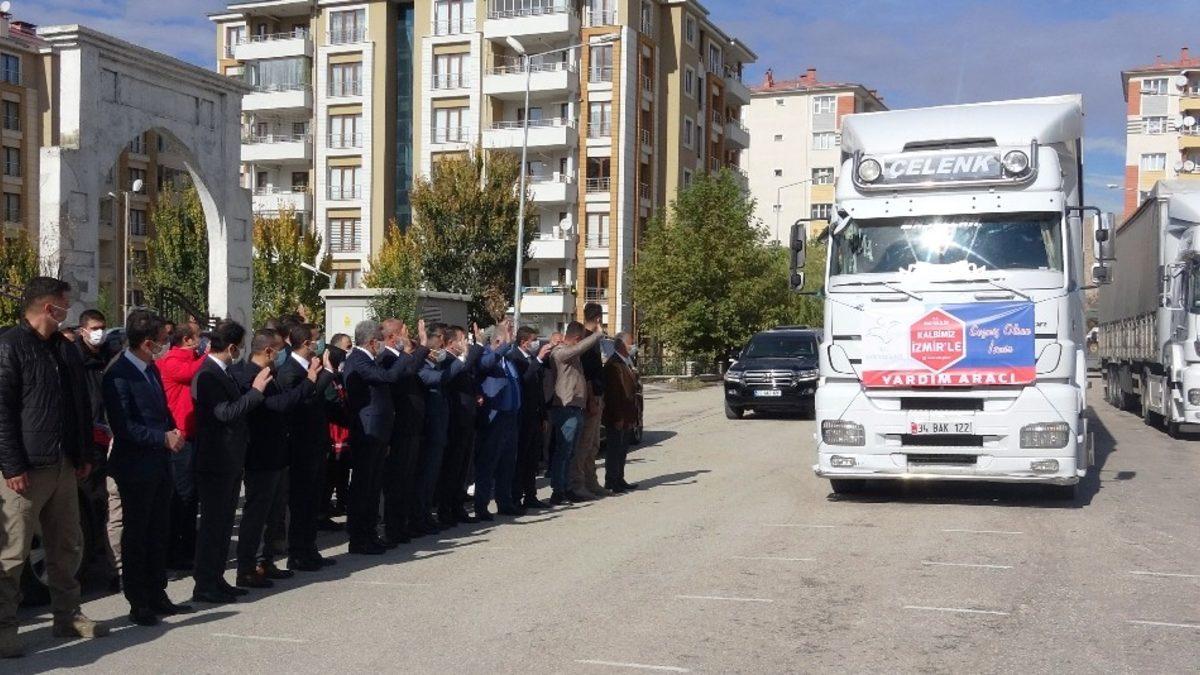 Vali Bilmez’in açıklamasının ardından yardım tırları dualar eşliğinde İzmir’e uğurlandı.