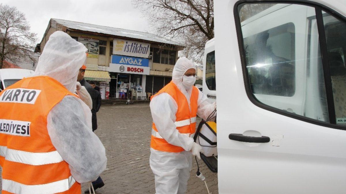 Tüm dünyayı etkileyen korona virüsü nedeniyle önlemlerini artıran Varto Kaymakamlığı ve Varto Belediye Başkanlığı ekipleri, özel kıyafetler giyerek kamu kurum ve kuruluşları dezenfekte ettikten sonra ilçe merkezinde bulunan terminal, garajlar ve taksi durakları ile şehir içi toplu taşıma araçlarında dezenfekte çalışması yaptı.