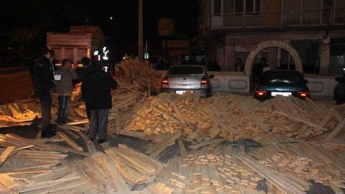 Aydın’ın Nazilli İlçesinde aşırı tonajlı kamyon, kavşakta hızını alamayınca 20 ton keresteyi yola savurdu. Kazada, park halindeki 3 otomobil ve elektrik dağıtım trafosu kerestelerin altında kaldı. Kamyon şoförüne öfkelenen vatandaşları ise polis sakinleştirdi.Kaza, bugün gece yarısı Dörtyol Kavşağı’nda meydana geldi. Edinilen bilgiye göre, Muhammet Hüsrev Gündal yönetimindeki 32 E 5191 plakalı kereste yüklü kamyon, kavşakta hızını alamayınca tonlarca kereste yola savruldu. Isparta’dan yüklenen keresteleri Aydın’a götüren şoförün aşırı yük ve hızlı gittiğini iddia eden mahalle sakinleri ise sürücüyü linç etmek istedi.Olay yerine gelen polis ekipleriyle de tartışan vatandaşlar, güçlükle sakinleşti. Kaza’da 3 otomobil, sinyalizasyon direği ve mahallenin elektrik dağıtım trafosu yükün altında kaldı. Polis, kamyon sürücüsünü ifadesini almak üzere karakola götürürken, itfaiye ekipleri ile belediye görevlileri ise kaldırıma devrilen kerestelerin altında birinin olup olmadığını kontrol etti.Kazada otomobilleri zarar gören 3 kişi, kamyon sürücüsünden şikayetçi oldu. Şehrin göbeğinde bulunan kavşakta sürekli kaza olduğunu belirten vatandaşlar, yetkililerden ağır taşıtlar için çevre yolu yapılmasını istedi. Kaza sonrasında yolun bir şeridini kaplayan keresteler ekipler tarafından kaldırıldıktan sonra trafik normal akışına döndü.