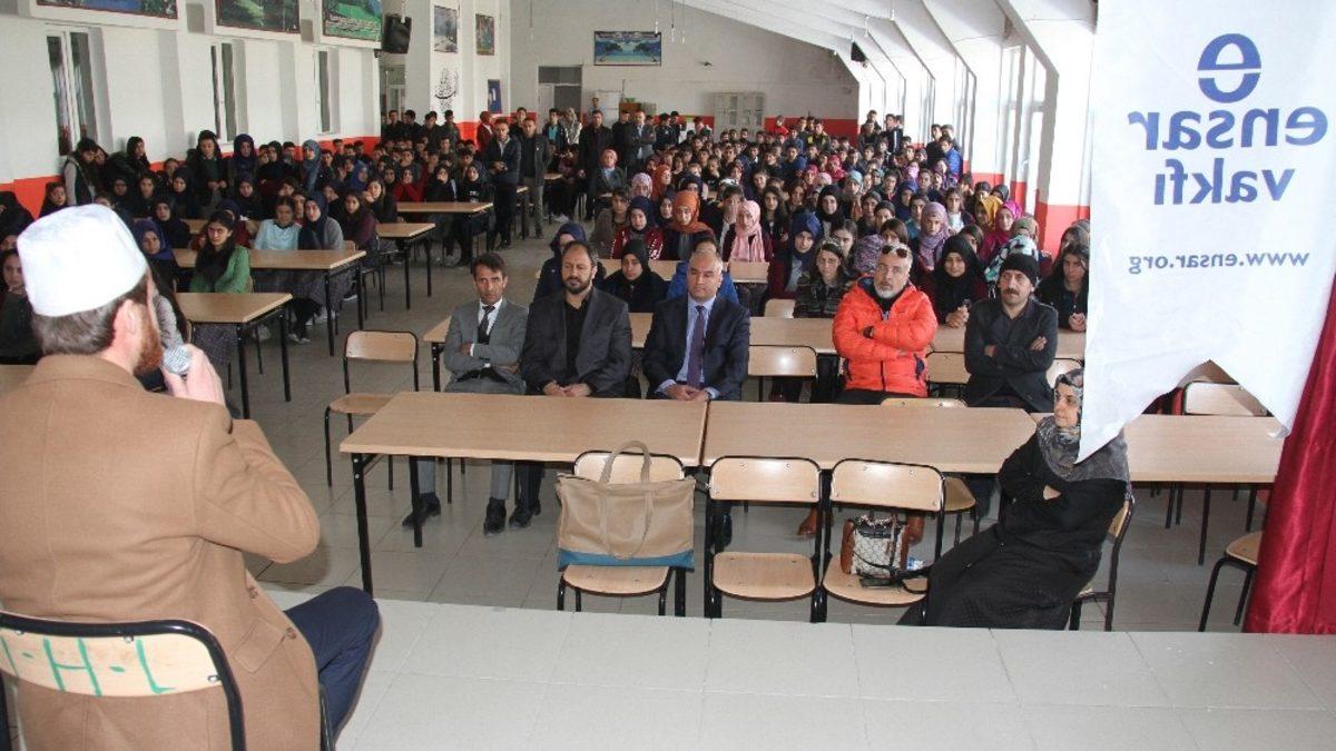 Muradiye Kız Anadolu İmam Hatip Lisesinde Muradiye Ensar Vakfı tarafından organize edilen konferansa; İlçe Müftüsü Abdulselam Özdere, Muradiye Ensar Vakfı Başkanı Selçuk Yay, Ensar Vakfı üyeleri ve öğrenciler katıldı. Merkez Cami İmamı Hafız Emrullah İnan’ın Kur’an-ı Kerim tilavetiyle başlayan konferansta açılış konuşması yapan Başkan Selçuk Yay, “Üzülme, davanın sahibi Hak’tır. Hak olan davada, zafer muhakkaktır. Zaferin muhakkak olduğuna inandığımız bu dava yolunda çektiğimiz her çile bizim için şereftir, bir beraat belgesidir” dedi.