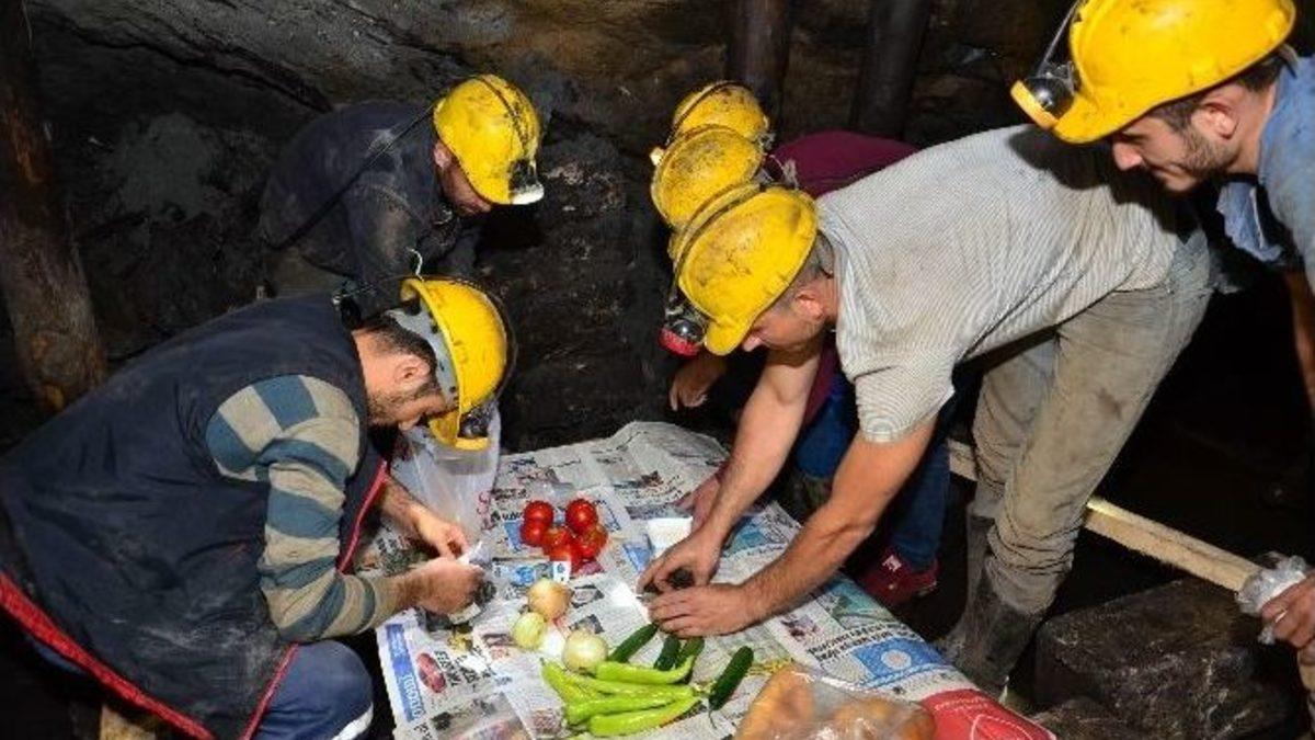 Zonguldak’ta maden işçileri, Ramazan ayının ilk sahurunu yerin 400 metre altında yaptılar. İşçiler, domates, peynir, zeytin ve soğandan oluşan menü ile ailelerinden uzakta oruca niyetlendiler.Kilimli ilçesine bağlı Gelik beldesinde özel bir maden ocağında gece vardiyasında çalışan işçiler, Ramazan ayının ilk sahurunu yerin 400 metre altındaki madende yaptılar. Sahur vaktinin gelmesiyle tahtalardan sofra kuran işçiler, işe bir süreliğine ara verip sahur yaptılar. Yanlarında getirdikleri konserve, soğan, ekmek, domates, biber ve salatalıktan yiyen işçiler, yemeğin ardından dua ettiler.10 yıldan bu yana maden ocağında çalışan Hasan Demir, "Yerin altında çalışıyoruz. Çalışmak mecburiyetindeyiz. Ekmek parası, bizim kaderimiz bu. İlk sahuru yaptık. Ailemizden uzaktayız ama mutluyuz. Çalışmayı seviyoruz" diye konuştu.İki çocuk babası maden işçisi Ahmet Kürekçi ise "Bu sahur sabahını ailemizden uzakta geçirdiğimiz için hüzünlüyüz ama arkadaşlarımızla geçirdiğimiz için mutluyuz. Arkadaşlarımızla nice Ramazanlara erişmeyi, bütün Ümmet-i Muhammed’e hayırlara vesile olmasını dileriz. Çalışmak da ibadettir. Bu sahuru burada yapmak bize nasip oldu. Allah, arkadaşlarımızla beraber kazasız belasız çalışmayı nasip eder. İnşallah bir dahaki Ramazanları da ailelerimizle beraber geçirmeyi nasip eder. Bütün arkadaşlarımıza kazasız belasız iş diliyoruz" dedi.Kömür üretimine kısa süreliğine ara verip sahur yapan işçiler, yemeğin ardından kömür üretimine devam ettiler.