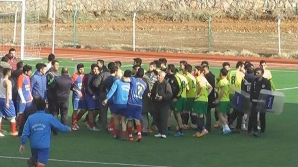 Kahramanmaraş’ta amatör lig maçında mücadele eden iki takım oyuncuları küfürleşme sonrası tekme tokatla birbirine girdi. Kavgayı ayırmakta güçlük çeken polis havaya ateş etti. Çıkan olaylarda 2 futbolcu yaralandı.Kahramanmaraş 1. Amatör Küme Büyükler Ligi’nin 11. hafta maçında Pazarcık Kartalkayaspor kendi sahasında Fidanspor’u konuk etti. Pazarcık İlçe Stadyumu’nda karşı karşıya gelen Fidanspor, ev sahibi takımı 2-1 mağlup etti. Maçın bitiş düdüğü ile birlikte Fidanspor ile Pazarcık Kartalkayaspor arasında sözlü tartışma başladı. Çıkan tartışmanın kavgaya dönüşmesi sonucu her iki takım oyuncuları tekme tokatla birbirlerine saldırdı.Sahada hazır bekleyen polis kavgayı ayırmakta zorlanınca zaman zaman havaya ateş etti. Çıkan olaylarda Fidanspor takımından 2 futbolcu hafif yaralandı.