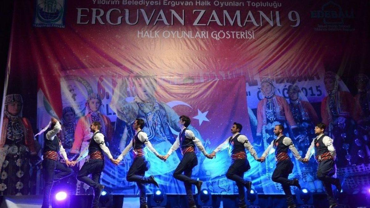 Düzenlediği birbirinden renkli etkinliklerle ilçedeki sosyal yaşamı canlandıran Yıldırım Belediyesi’nde, Erguvan Halk Oyunları Topluluğu’nun sahnelediği ‘Erguvan Zamanı 9’ isimli gösteri izleyenleri büyüledi.Dört farklı yaş kategorisinde, 250’den fazla halk oyunları dansçısı ile kültürümüzün önemli unsurlarından biri olan folklor oyunlarını genç kuşaklara aktaran Erguvan Halk Oyunları Topluluğu, Anadolu’nun kültürel zenginliğini sahneye taşıdı. Barış Manço Kültür Merkezi’nde gerçekleştirilen ve çok sayıda Yıldırımlının katıldığı ‘Erguvan Zamanı 9’ isimli gösteride Bursa, Artvin, Aydın, Erzurum, Van, Burdur, Kastamonu, Ağrı, Gaziantep, ve Trabzon yörelerine ait oyunlar ile Roman, Anadolu Ateşi, 7 Bölge 7 Yöre gösterileri Erguvan Halk Oyunları Topluluğu dansçıları tarafından sergilendi. Uzman eğitmenlerin öncülüğünde 7-10 yaş küçükler, 11-14 yaş yıldızlar, 15-21 yaş gençler ve 25 yaş üzeri yetişkinler gruplarıyla, Anadolu’nun dört bir yanından asırlardan bu yana gelen kültür mozaiğini sahneye taşıyan Erguvan Halk Oyunları Topluluğu’nun hazırladığı gösteri izleyenlerden büyük alkış topladı. Özellikle küçük grup tarafından sahnelenen Aydın yöresine ait oyun Yıldırımlıları coşturdu.