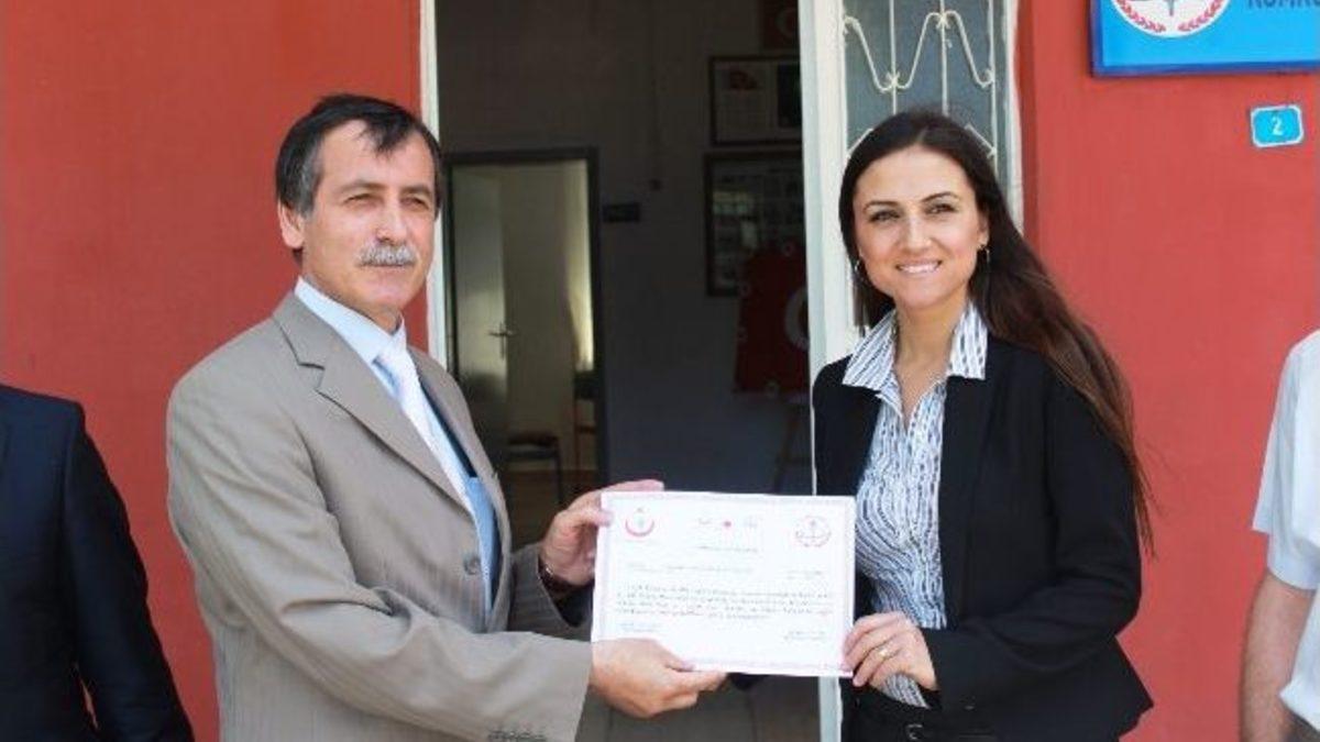 Samsun Milli Eğitim Müdürü Mustafa Cora, Çarşamba İlçe Milli Eğitim Müdürü Telat Aktaş ve İl Sağlık Müdürlüğü’nden temsilciler ile birlikte Kumköy İlkokulu’nu ziyaret eden ekip okul öğretmeni Dilek Livaneli’ye Beyaz Bayrak ile birlikte belgelerini sundu.