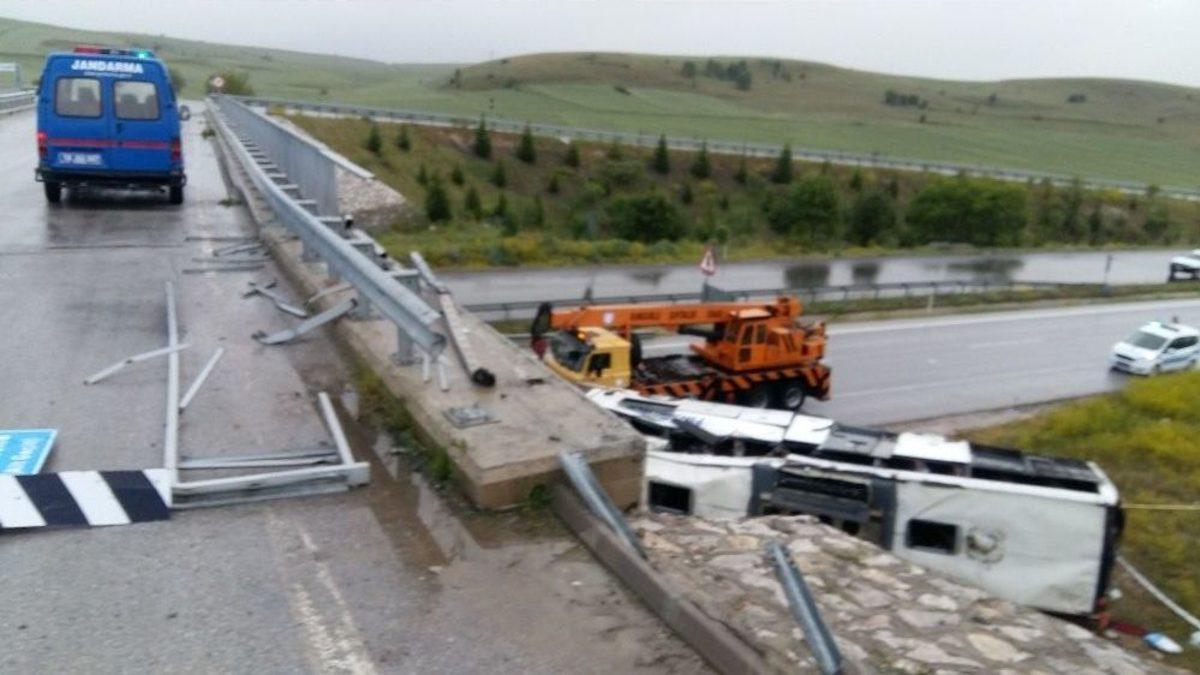 Çorum’da bir yolcu otobüsünün üst geçitten uçması sonucu meydana gelen trafik kazasında 48 kişi yaralandı.Edinilen bilgilere göre, Giresundan Ankara’ya seyir halinde olan 33 LD 900 Mehmet Oğuz yönetimindeki otobüs Çorum-Ankara karayolu 40. kilometresinde üst geçide yanlışlıkla çıkarak yaklaşık 5 metre yükseklikten aşağı uçtu. Kazada 2’si Irak uyruklu olduğu öğrenilen 48 kişi yaralandı.Yaralılar Çorum ve Sungurlu Devlet Hastanelerine ambulanslarla kaldırılarak tedavi altına alındı.