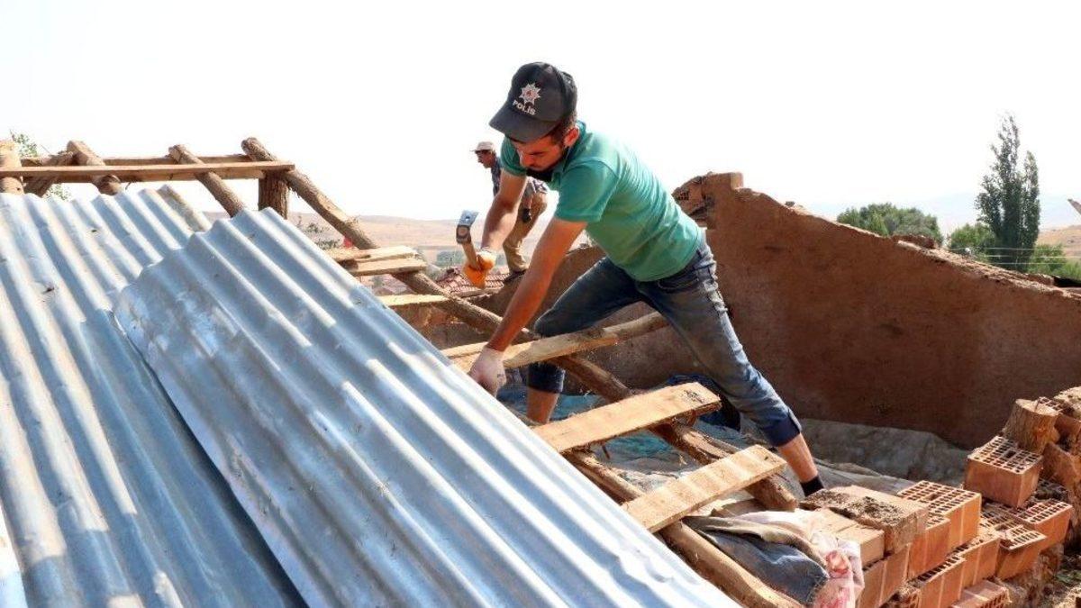 Yozgat’ta dün öğle saatlerinde meydana gelen hortum sonucu evleri ve ahırları zarar gören Buzağcıoğlu köyü sakinleri günün ilk ışıklarıyla birlikte yaralarını sarmaya başladı.Yozgat merkeze bağlı Buzağcıoğlu köyünde dün akşam saatlerinde meydana gelen hortum sonucu 10 ev ve bazı ahırların çatıları uçmuş, çok sayıda ağaç ise kökünden sökülerek evlerin üzerine düşmüştü. Buzağcıoğlu köyü sakinleri zarar gören ahır ve evlerini günün ilk ışıklarıyla birlikte tamir etmeye başladı. Can kaybının yaşanmadığı hortum sonrası köy sakinleri AFAD ekiplerinin de köylerine gelerek hasar tespit çalışması yapacaklarını söyledi.Yaşanan hortum sonrası evi zarar gören Seyit Taşdemir isimli vatandaş, olayı anlatırken durumu köy muhtarının AFAD ekiplerine bildirdiğini ve hasar tespit çalışmaları yapacaklarını söyledi. Muammer Taşdemir ise kendi imkanlarıyla zarar gören çatılarını eldeki malzemelerle yapmaya başladıklarını dile getirdi.Evinin, ahırının ve bahçesinin hortum sonrası büyük oranda zarar gördüğünü vurgulayan Murat Ekici de Yozgat’tan usta getirdiğini ve kendi imkanlarıyla zarar gören yerleri yeniden yapacaklarını ifade etti.