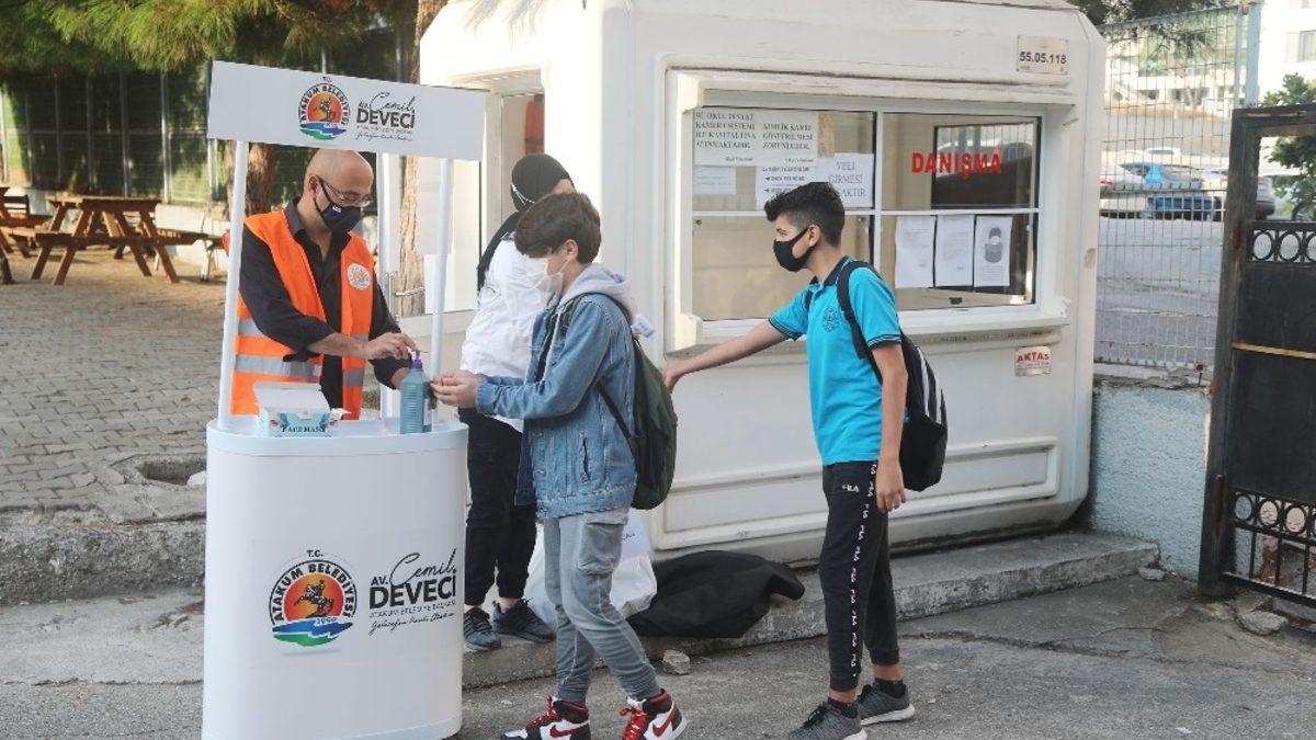 Atakum Belediyesi ekipleri 24 ayrı okula kurduğu stant ile yüz yüze eğitime başlayan öğrencileri karşılayarak maske dağıtıp, dezenfektan kullanmalarını sağladı.