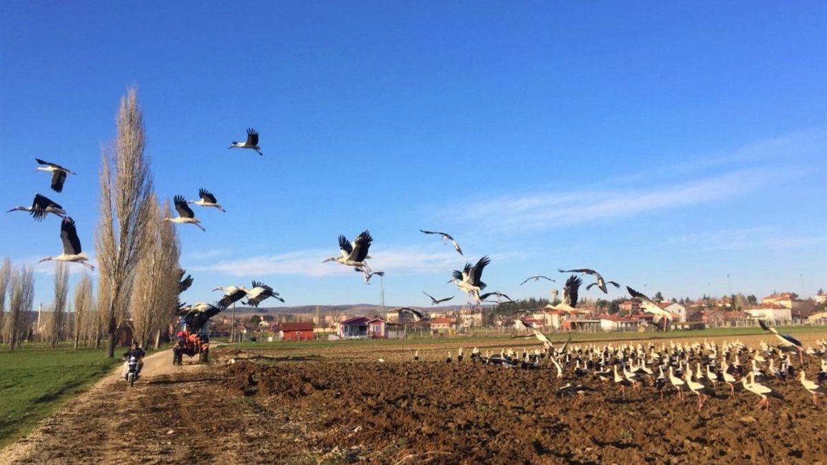 Yaz aylarına sayılı günler kala Afrika’dan sürüler halinde sıcak bölgelere uçan leylekler, Türkiye topraklarına göç etmeye başladı. Göç esnasında kanat çırpmadan kilometrelerce yol kat edebildikleri bilinen uzun gagalar, Eskişehir’in Çukurhisar beldesinde dinlenmek için kondukları boş bir tarlada objektiflere yansıdı. Siyah beyaz renkleri ve geniş kanatları ile görenleri hayran bırakan yüzlerce leylek, havada olduğu gibi karada da görsel şölen oluşturdu.