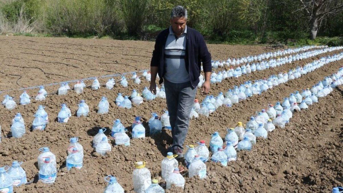 Yozgat’ta gece hava sıcaklığının eksi 2 dereceye düşmesiyle yaşanan don meyve ağaçlarına zarar verirken, çiftçi Hacı Ömer Kılıç hurdacıdan topladığı 3 bin pet şişe ile kurduğu serasında sebzelerini dona karşı koruyor.Yozgat’ın Başıbüyüklü köyü’de çiftçilik yapan Hacı Ömer Kılıç, don olayına karşı tarlasına 3 bin adet pet şişe ile kurduğu serasıyla ürünlerinin zarar görmesini engelledi. Kılıç, ilde geceleri sıcaklıkların eksi 2 dereceye kadar düşmesiyle oluşan dondan sebzelerini bu yöntemle korudu.Pet şişelerle kurduğu seranın faydasını gördüğünü söyleyen Kılıç, bu yöntemi diğer çiftçilere de önerdi. Kılıç, “Domateslerde, fasulyelerde ve salatalıklarda sadece ana yaprakların uç kısımlarında bir kavrulma oldu ama gövde bölgesinde hiçbir sorun yok. Kurduğum yöntem işime yaradı. Zaten deneme amaçlı yapmıştım. Planlarıma göre bir ay önce hasat yapmayı düşünüyorum” dedi.Sebze ekimini bulduğu yöntemle yapmasa tüm ürünlerin soğuktan etkileneceğini söyleyen Kılıç, “Bu ekimi açık alanda serasız yapmış olsaydık ağaçların meyvelerinin yandığı gibi bunlar da yanacaktı. Emeklerimiz de boşa gidecekti. Bu yöntemi diğer çiftçilere de tavsiye ediyorum, olumlu sonuç aldım. Ceviz, elma, erik ve kiraz çiçeklerini soğuk yaktı. Ama sebzelerime bir şey olmadı” şeklinde konuştu.