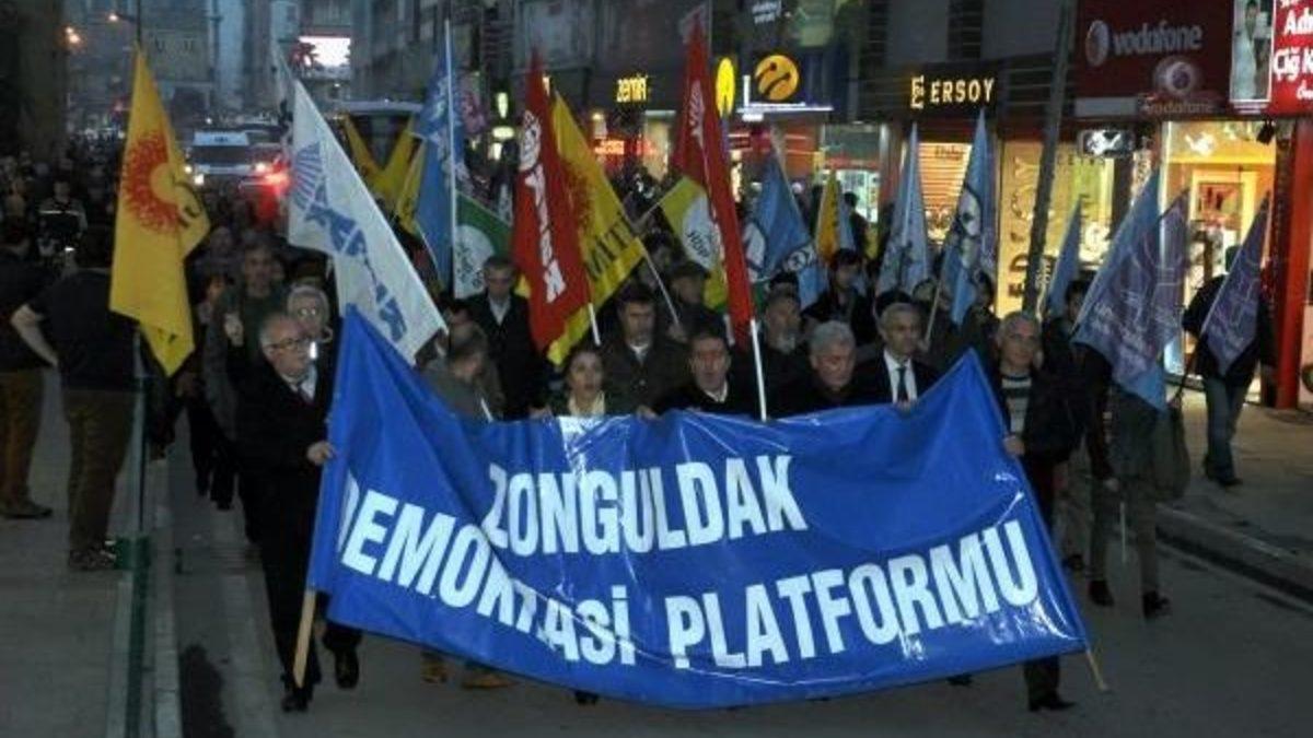 Durmuş SEVİNDİK/ZONGULDAK, Madenci Anıtı önünde toplanan yaklaşık 100 kişi, ‘Gericiliği ve faşizmi yeneceğiz’ pankartı açarak ‘Faşizme karşı omuz omuza’, ‘Direne direne kazanacağız’, ‘Baskılar bizi yıldıramaz’, ‘Zafer sokakta kazanılır’ sloganları atıp Gazipaşa Caddesi'ni takip ederek Valilik önüne kadar yürüdü. Burada konuşan platform sözcüsü Erdoğan Kaymakçı, İç Güvenlik Yasa Tasarısı’nın Ak Parti hükümetini koruyup kollama yasası olarak hazırlandığını söyledi.