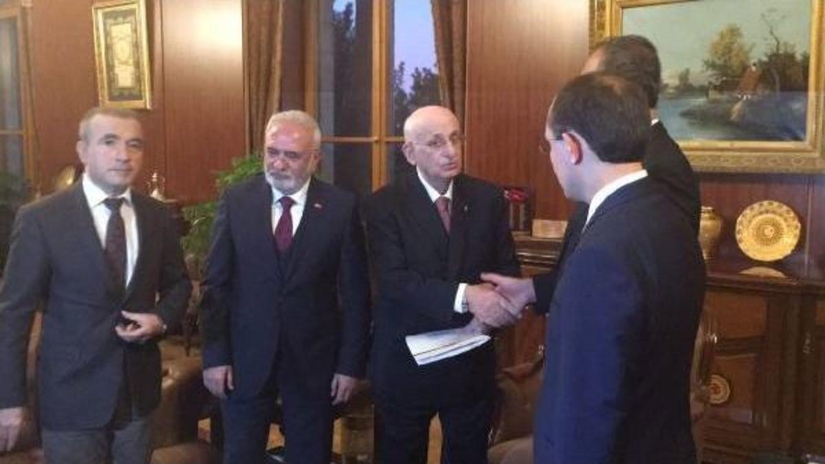 'Yeni anayasa' taslak metni AK Parti Grup Başkanvekilleri Mustafa Elitaş, Naci Bostancı, Mehmet Muş ve AK Parti Genel Sekreteri Abdulhamit Gül tarafından Meclis Başkanı İsmail Kahraman'a verildi. Meclis Başkanvekili Ahmet Aydın'ın da katıldığı sunuşta teklif hakkında kısa bir bilgi veren Mustafa Elitaş, daha sonra anayasa taslağını İsmail Kahraman'a verdi. Taslak dosyasını alan İsmail Kahraman "Sonucun hayırlı olmasını diliyorum" dedi.