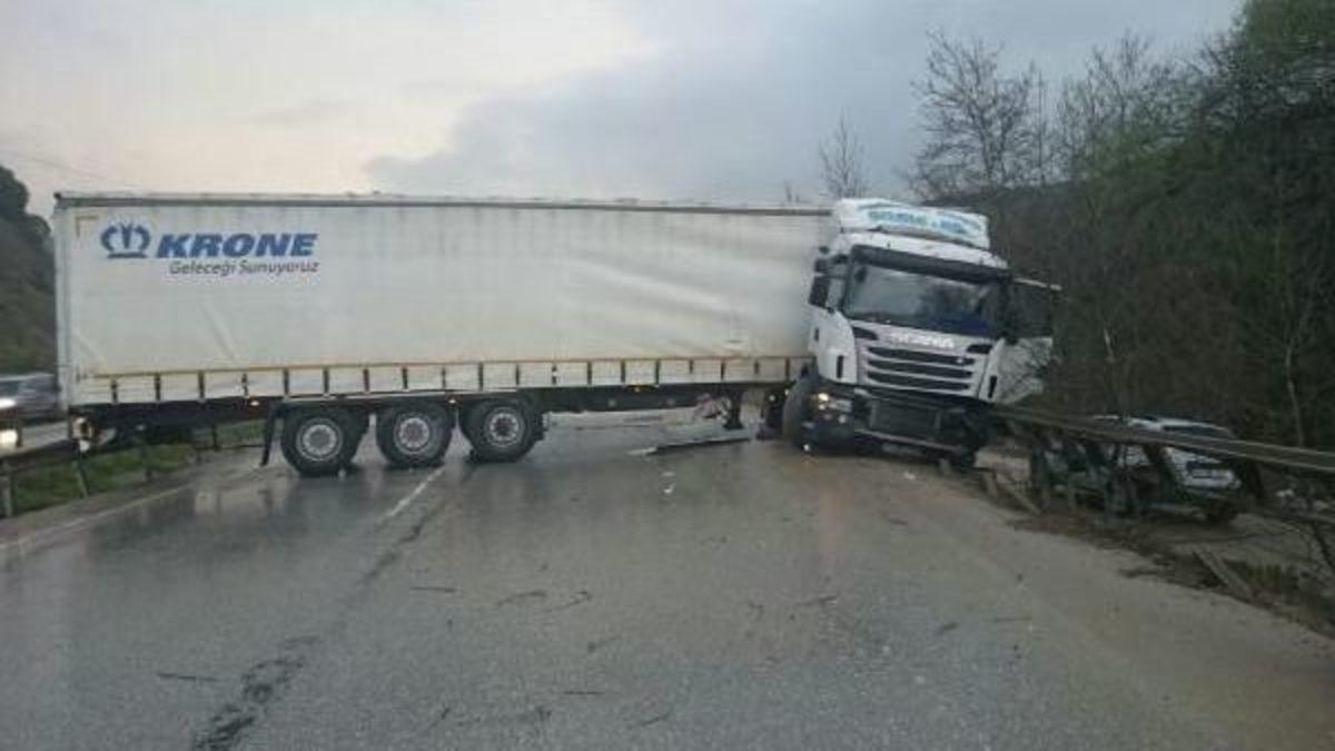 Hasan BOZBEY/ ORHANGAZİ Kaza, akşam sıralarında Karsak kavşağı yakınlarında meydana geldi. Bursa yönüne giden 38 yaşındaki Hasan Arık yönetimindeki 16 AEJ 68 plakalı TIR, yağmur nedeniyle kayganlaşan yolda sürücüsünün kontrolünden çıktı. Yan dönen TIR bariyerlere çarparak durdu ve yolu tamamen trafiğe kapattı. TIR’ın arkasından gelen araç sürücüleri ise korku dolu anlar yaşadı, ancak şans eseri TIR’a çarpan olmadı.