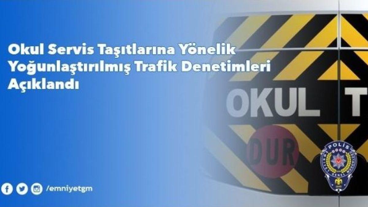 Emniyet Genel Müdürlüğü, 1-2 Aralık tarihlerinde 07.30-10.00 ile 14.30-16.00 saatleri arasında okul servis araçlarında yoğunlaştırılmış denetimler uygulanacağını bildirdi.Emniyet Genel Müdürlüğünden yapılan açıklamada, kış mevsiminde oluşan aşırı yağmur, sis, kar, tipi, buzlanma gibi nedenlerle sürücülerin görüş mesafesinin azaldığı ve bu durumdan trafik güvenliğinin olumsuz etkilendiği belirtilerek, "Alınan tüm tedbirlere rağmen 2016 yılının on aylık döneminde okul servis araçları bin 403 adet trafik kazasına karıştı. Bu kazalar sonucunda 5 vatandaşımız hayatını kaybederken, 2 bin 784 vatandaşımız ise yaralandı. Bilhassa son günlerde meydana gelen olumsuz hava koşullarında, özellikle sabahın ilk saatleri, gece don ve gizli buzlanma olaylarının yaşandığı da dikkate alınarak, okul çağındaki çocuklarımızın huzur ve güven içerisinde yolculuk yapmaları ve servis araçlarının karışabileceği trafik kazalarının önlenmesi amacıyla Emniyet Genel Müdürlüğünce okul servis araçlarına yönelik genel denetimlerin yanı sıra, 1-2 Aralık tarihlerinde 07.30-10.00 ile 14.30-16.00 saatleri arasında okul servis araçlarında yoğunlaştırılmış denetimler uygulanacak. Denetimlerde araçların fenni muayene durumu, sürücünün SRC belgesinin varlığı, emniyet kemerlerinin takılı olup olmadığı, güzergah özel izin belgesinin var olup olmadığı, dur lambasının bulunup bulunmadığı ve aktif kullanılıp kullanılamadığı, okul taşıt yazısının standartlara uygunluğu, rehber personelin bulunup bulunmadığı, pencere camlarının sabit ve filmli olup olmadığı, kış lastiklerinin bulunup bulunmadığı, ışık far donanımının durumu, aracın bakım onarım takip formu ve son kontrol tarihi, araçta bulunması gereken avadanlıkların olup olmadığına dair hususlar dikkate alınacaktır" denildi.