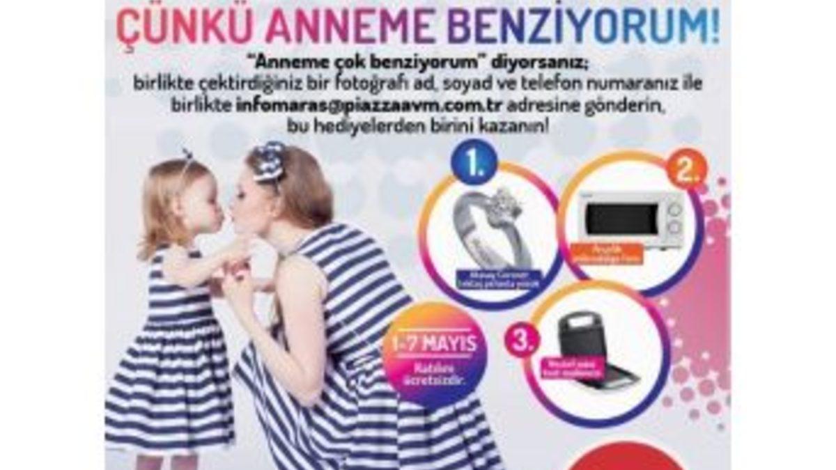 Kahramanmaraş Piazza, Anneler Günü etkinlikleri kapsamında annesine en çok benzeyen ziyaretçilerini ödüllendirecek.Yaşamlarını çocuklarına adayan annelerin en özel günü olan Anneler Günü’ne özel eğlenceli bir kampanya başlatan Kahramanmaraş Piazza, annelerine en çok benzeyen ziyaretçilerini ödüllendiriyor.Piazza’nın 1-7 Mayıs tarihleri arasında ücretsiz katılım olanağı sunduğu “Hediyeyi Kapıyorum Çünkü Anneme Benziyorum” kampanyasına katılmak isteyenlerin anneleri ile birlikte çektirdikleri bir fotoğrafı, kişisel bilgileri ile birlikte infomaras@piazzaavm.com.tr adresine göndermeleri yeterli olacak. Kampanya sonunda yapılacak değerlendirmede annesine en çok benzeyen ziyaretçi Coronet tek taş pırlanta yüzük, ikinci Arçelik’ten mikrodalga fırın, üçüncü ise Vestel’den mini tost makinesi kazanacak.