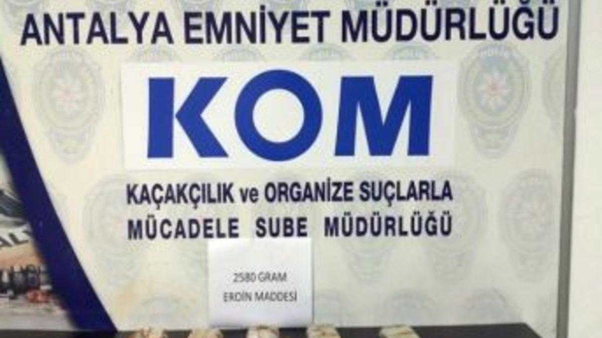 Antalya’da yapılan uyuşturucu madde operasyonunda 2 kilo 580 gram eroin ele geçirildi.Antalya Emniyet Müdürlüğü Kaçakçılık ve Organize Suçlarla Mücadele Şube Müdürlüğü ekiplerinin uyuşturucu madde ticareti yapan şahıslara yönelik çalışmalarında, Muratpaşa ilçesi Doğuyaka Mahallesi Termessos Bulvarı’nda bir araçta yapılan aramada, 5 paket halinde 2 kilo 580 gram eroin maddesi ele geçirildi. Olayla ilgili A.G. ve H.B. isimli şüpheliler gözaltına alındı. Şahısların, ’uyuşturucu madde ticareti yapmak ve sağlamak’ suçundan sevk edildikleri adli makamlarca tutuklandıkları belirtildi.