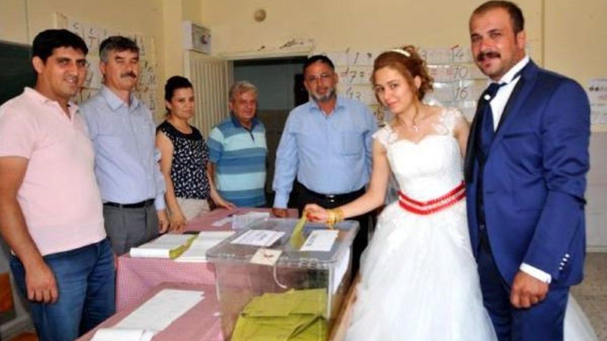 Antalya'nın Demre İlçesi'nde oto tamircisi 28 yaşındaki Ali Kocakaya ile kuaför 22 yaşındaki Vildan Kocakaya, dün akşamki düğünde evlendi. İlçenin geleneklerine göre bugün öğleden sonra kız evinden 'gelin alması' yapıldı. Yeni evli çift daha sonra oy kullanmak için gelinlik ve damatlıkla Yunus Emre İlkokulu'na gitti. Çift, 1028 nolu sandıkta oyunu kullandı.